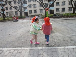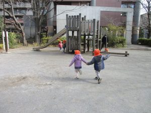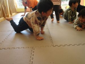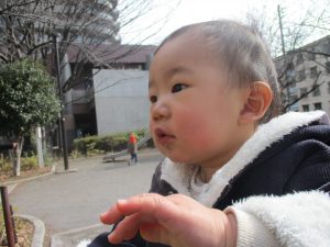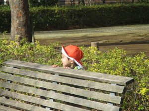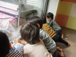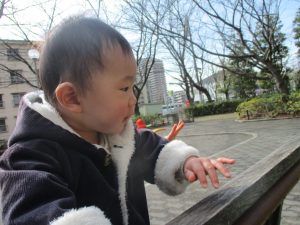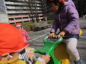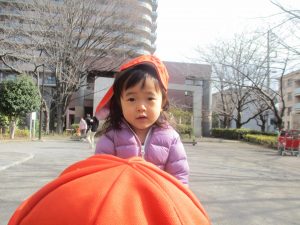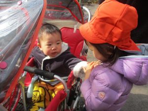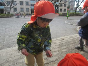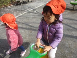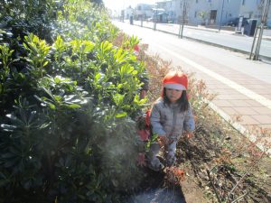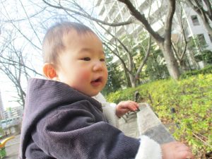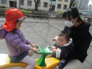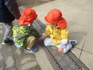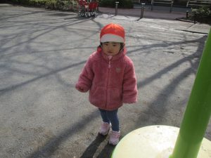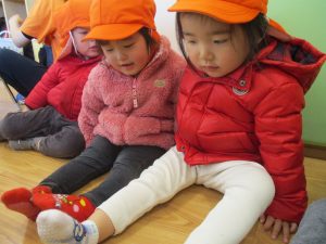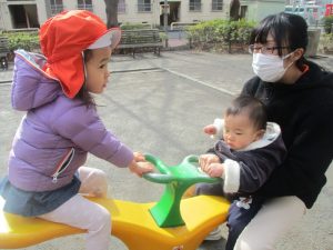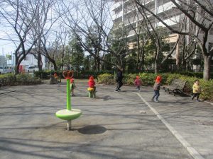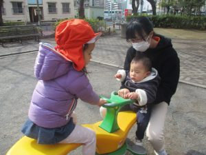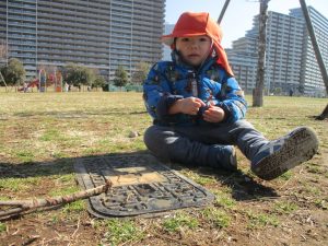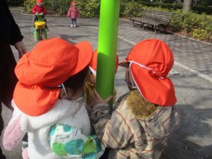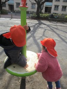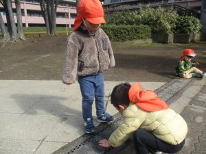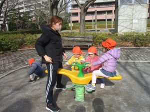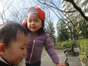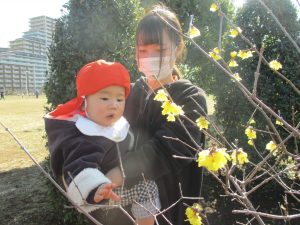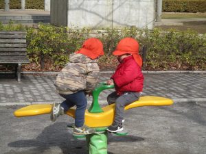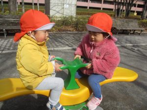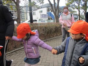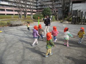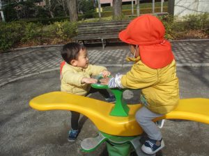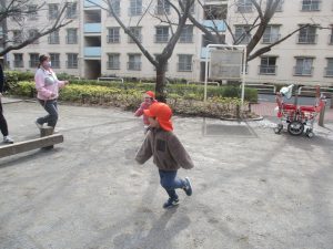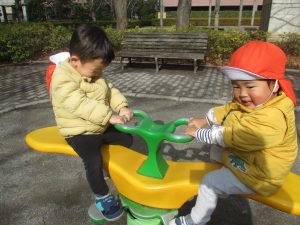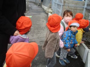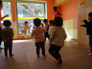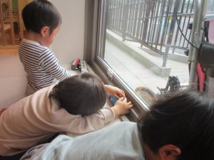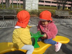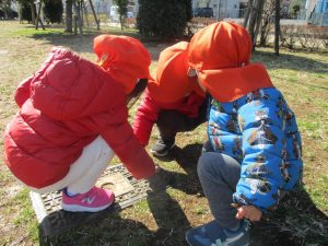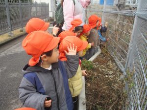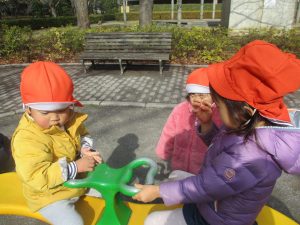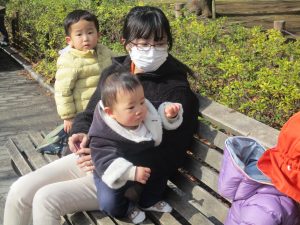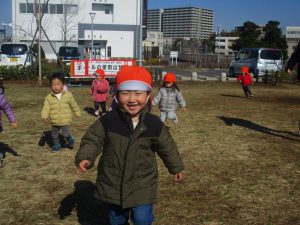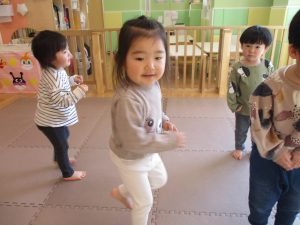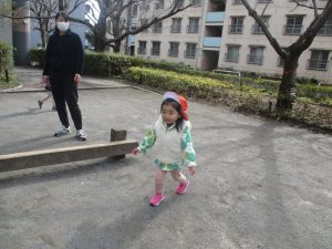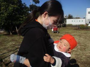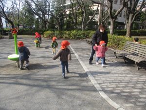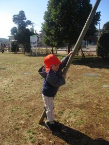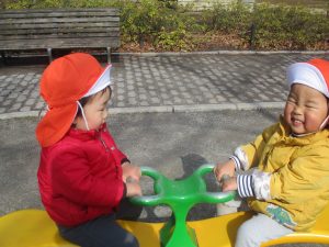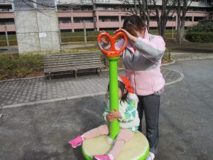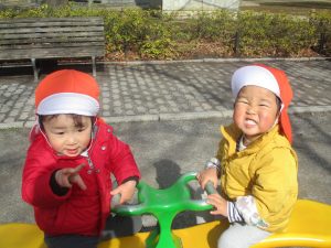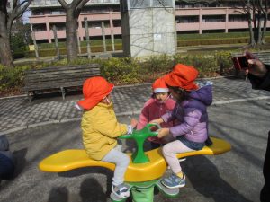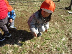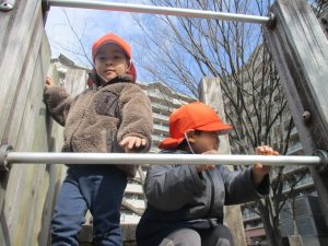 北風が身に沁みましたが予想以上に気温が上がり、快晴の中自然物探しや追いかけっこを通してたくさん体を動かして遊びました。