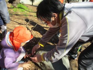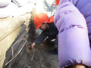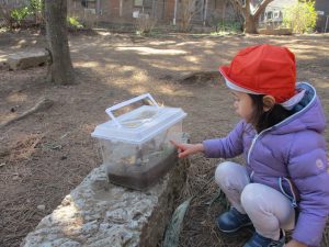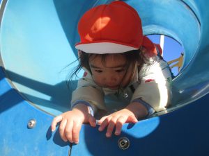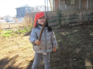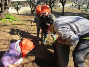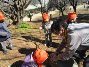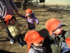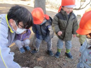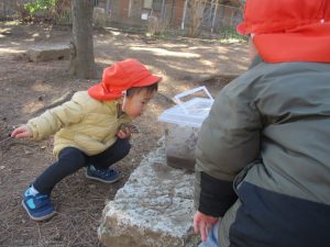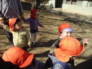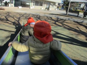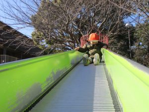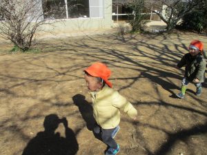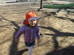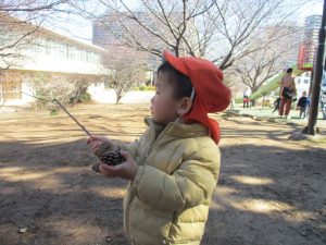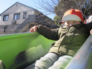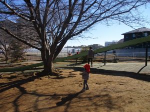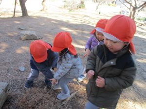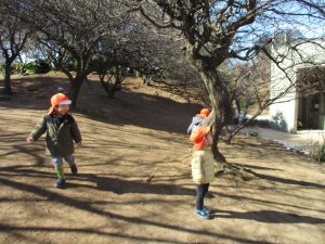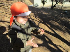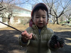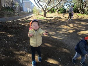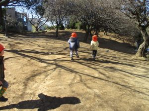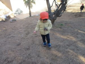 梅の花に見守られながら木の実探しや大好きなローラー滑り台を使って楽しく体を動かしました。