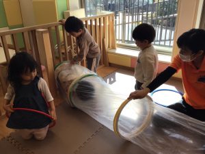 室内ではフープトンネルや風船を使って体を動かしました。