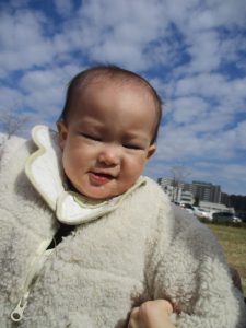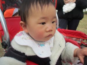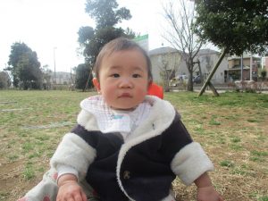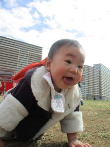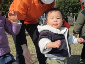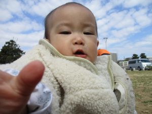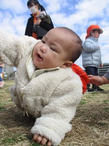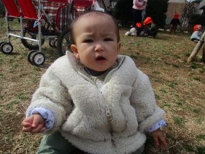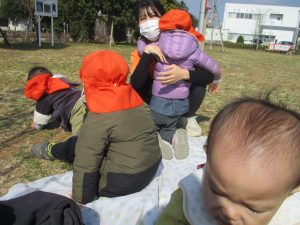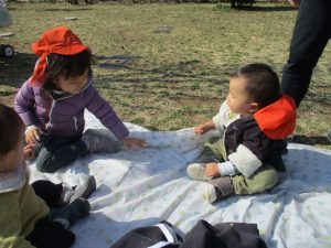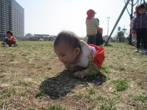 0歳児クラスのお友達はシートの上に座りお兄さんやお姉さんの遊ぶ姿をじーっと見つめたり、芝生の上に寝転んでは芝生の感触を味わっておりました♪
