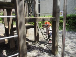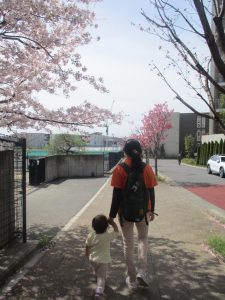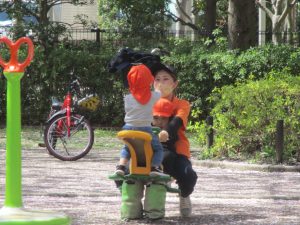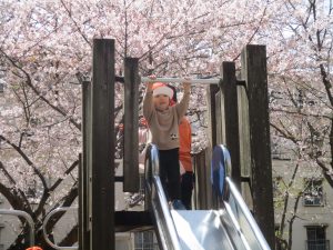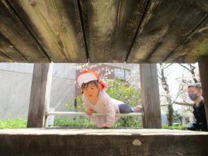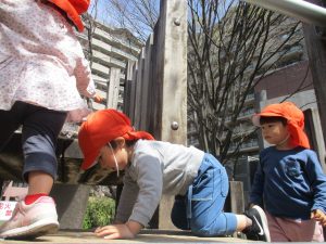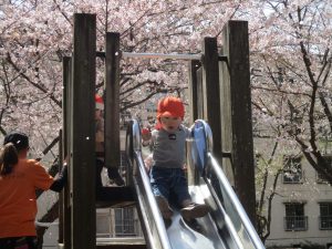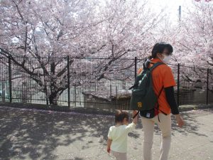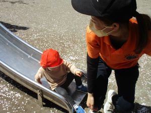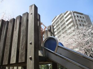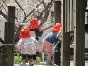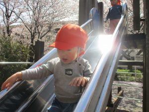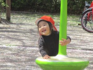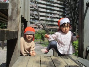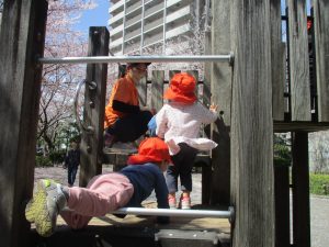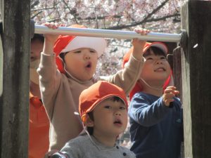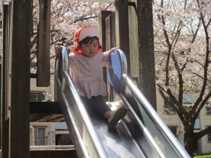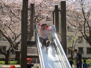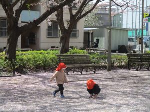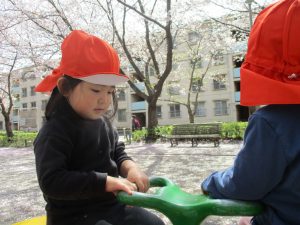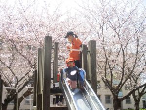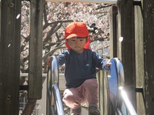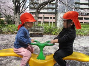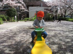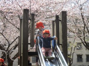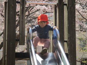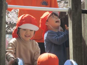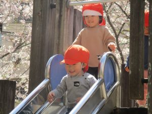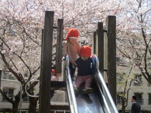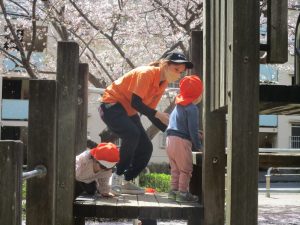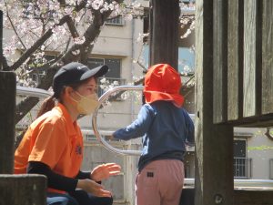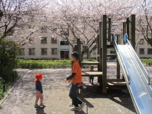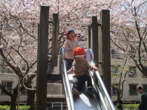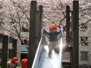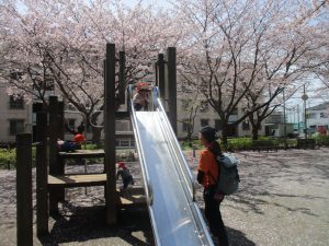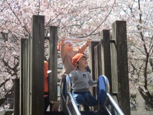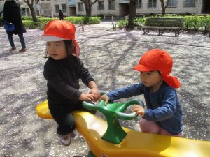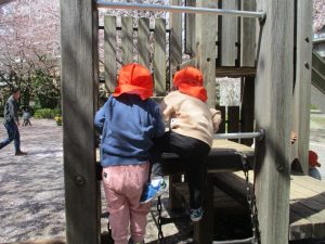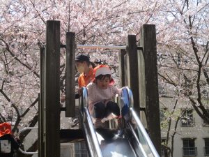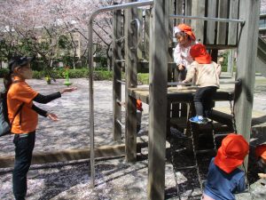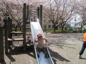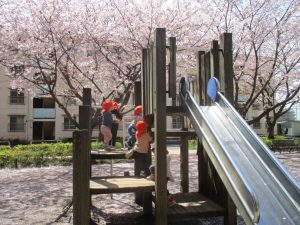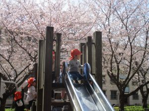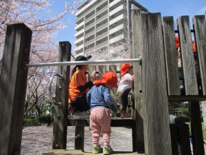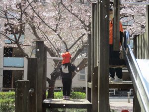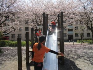 桜吹雪がひらひらと舞う中、子どもたちものびのびと滑り台やシーソーなど公園の固定遊具で体を動かして遊んでおられました。