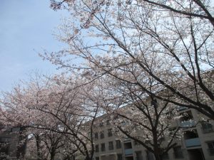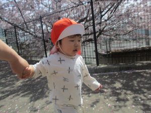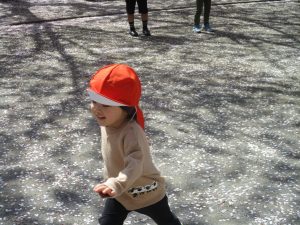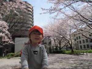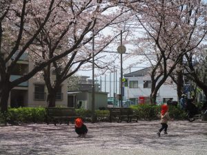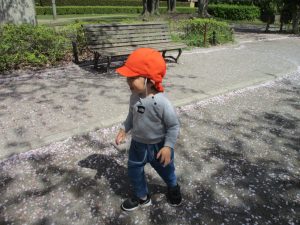 園周辺の桜の木からは、花びらたちが賑やかに舞い踊る様子が伺われます。