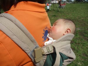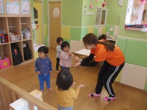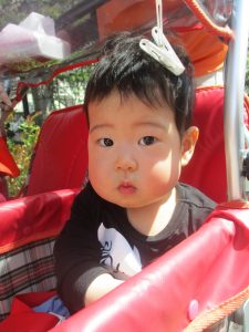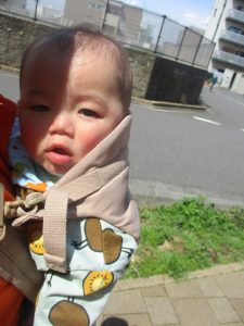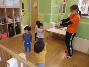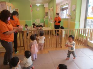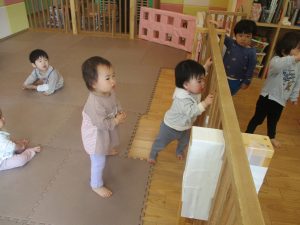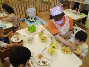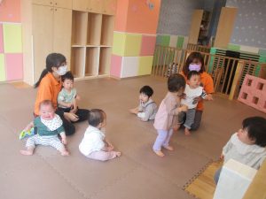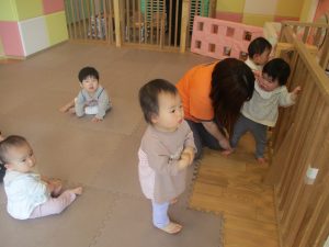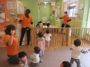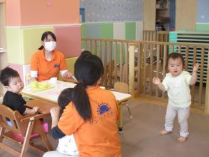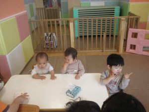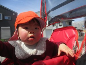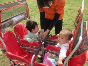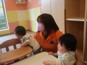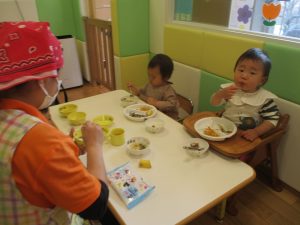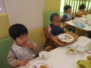 0、1歳児クラスのお友達も初めての戸外散歩、給食デビューを行いました。