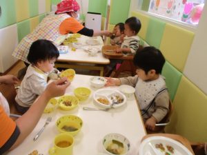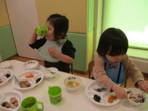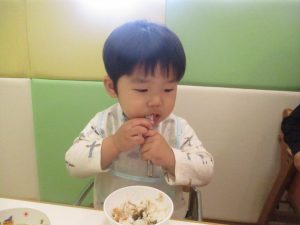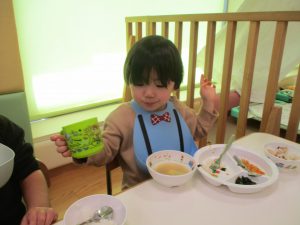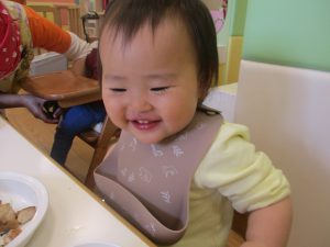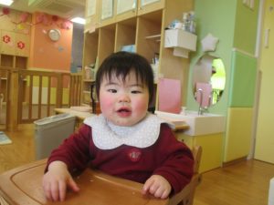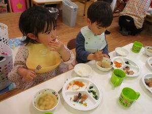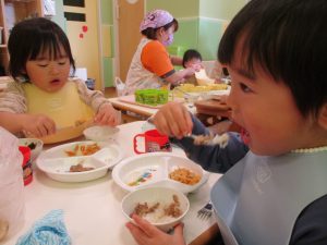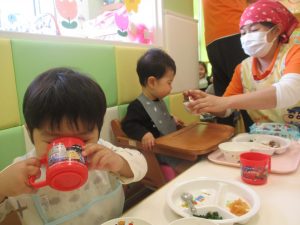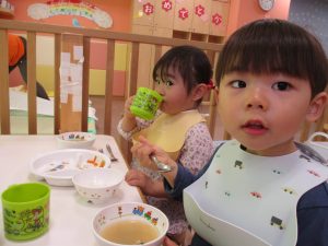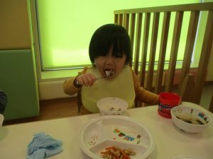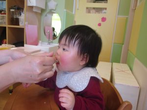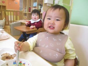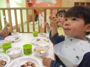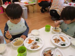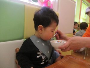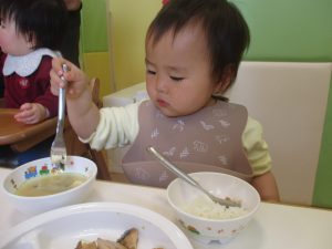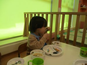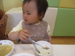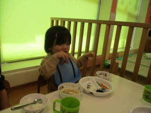 初めての給食では「なんだろう?」とドキドキしながらも、少しずつおいしさを確かめている様子でした。