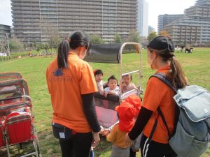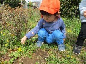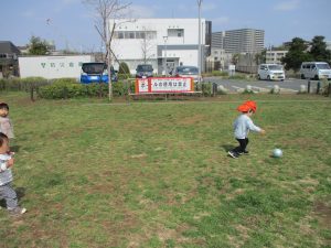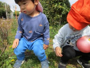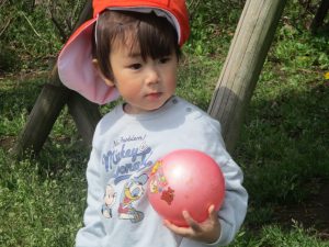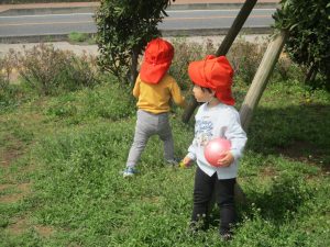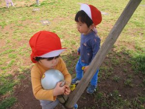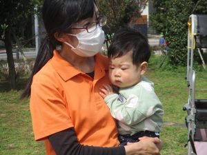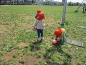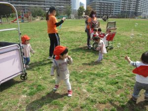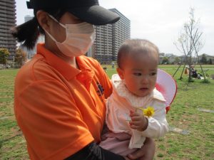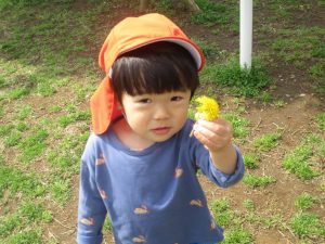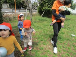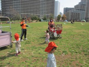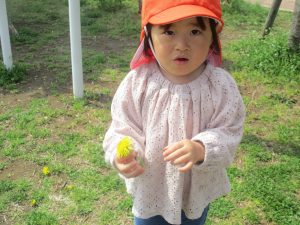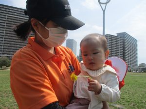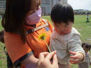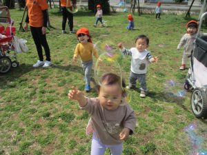シャボン玉やボールを追いかけたり、先生と一緒にたんぽぽなど草花を拾ったりして、春風を感じながらそれぞれのペースで遊んでおられました。