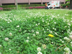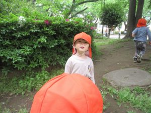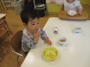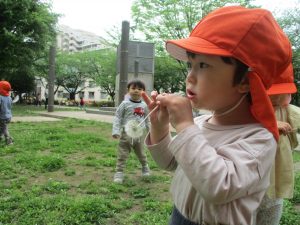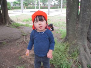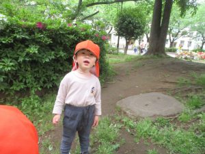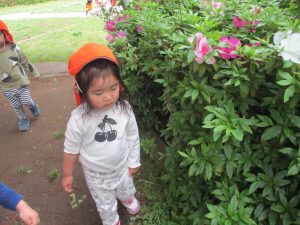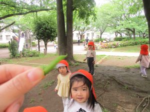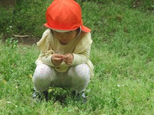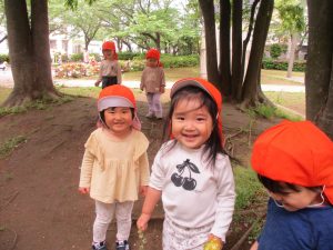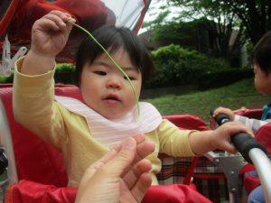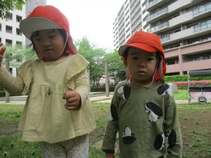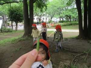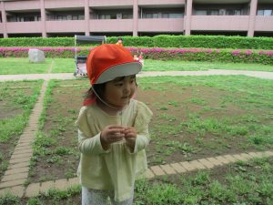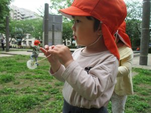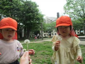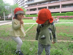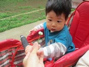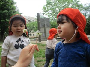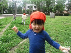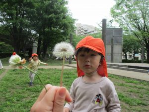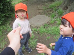 本日は奥の広場にて過ごしました。シロツメクサを見つけて摘んだり、たんぽぽの綿毛をを見つけて「フーッ」と息を吹きかけたり、先生がカラスノエンドウの豆で作った笛の音色にうっとりしたり、自然物との出会いを楽しんでおりました。