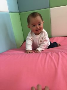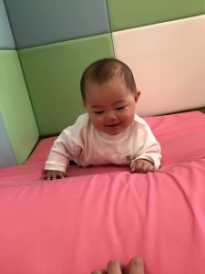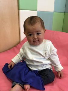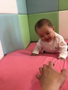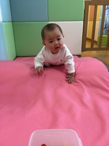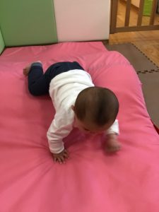 0歳児クラスのお友達は、室内にて過ごしました。お部屋の中にマットを敷いて、マット山を作って遊びました。