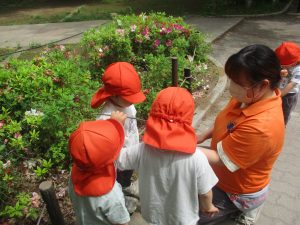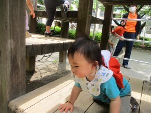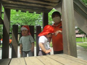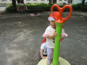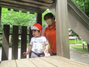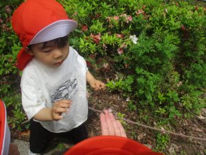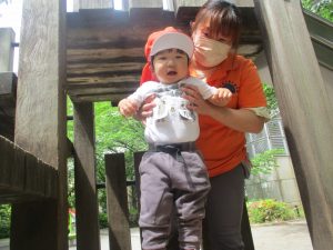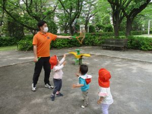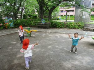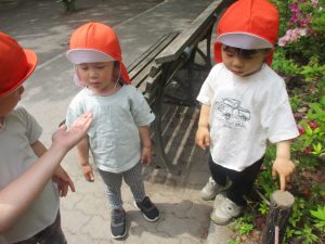 公園内では固定遊具を使用したりシャボン玉を追いかけて思い切り体を動かしたり、虫や花の自然物探しに夢中でした♪