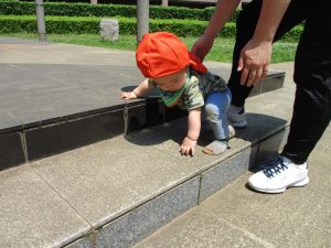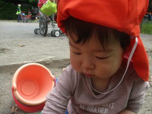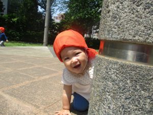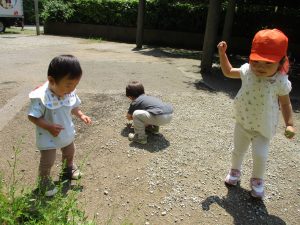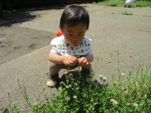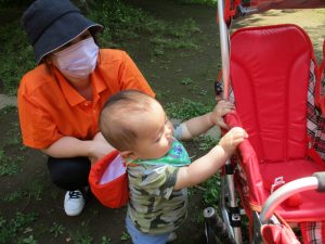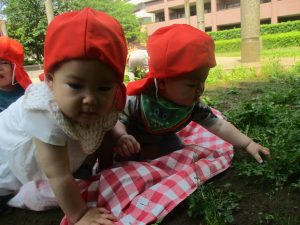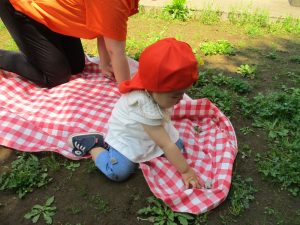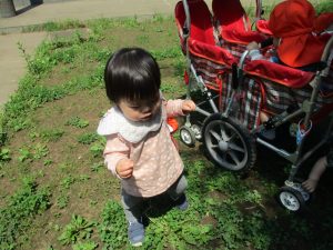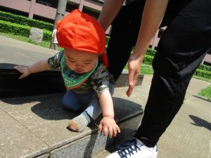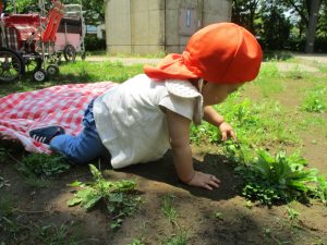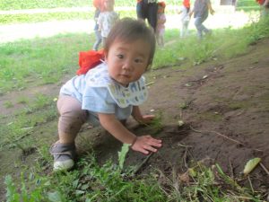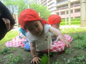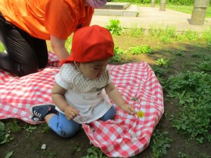 まだ歩けないお子様や0歳児クラスのお友達もぽかぽか気持ちのお天気の下、ハイハイやつかまり立ちをして先生や自然物との触れ合いを楽しんでおりました♡