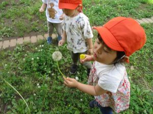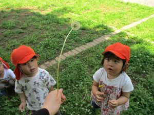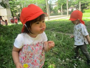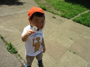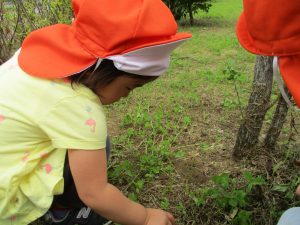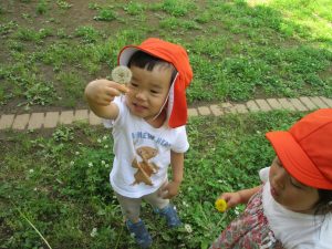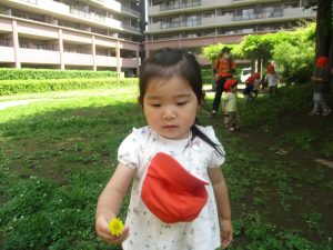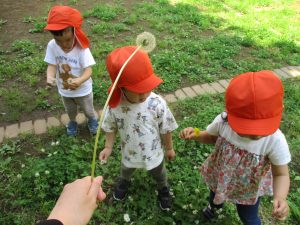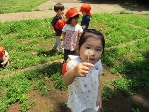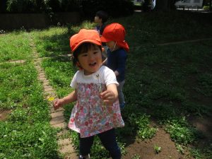 固定遊具の方も空いていたのですが、この日は朝から「てんとう虫探す~♪」や「たんぽぽ見つけるの♪」とのお子様たちの声があり、自然物とたくさん触れ合える広場の方にて過ごしました。