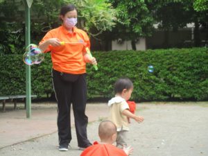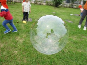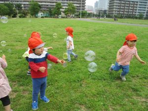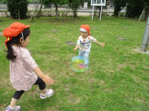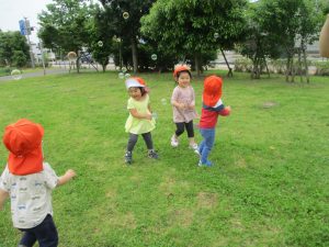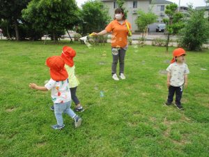 そんな中でもお友達が見つけた木の陰にある小さなアリの巣に集まって観察をしたり、ちょうちょうやシャボン玉を追いかけてみんなで元気いっぱいに過ごしておりました♡