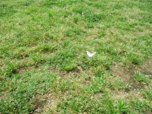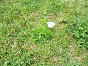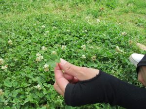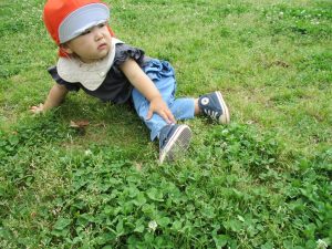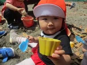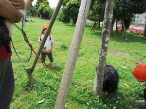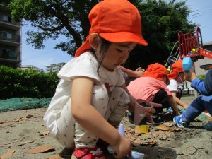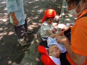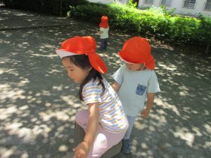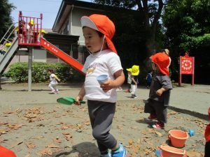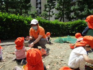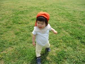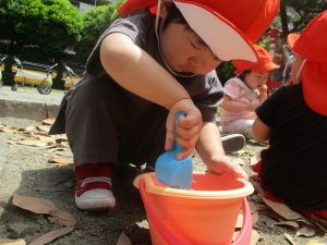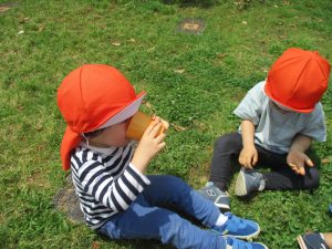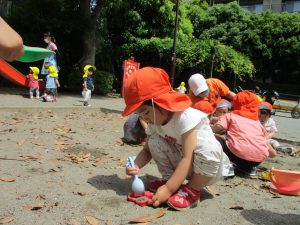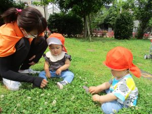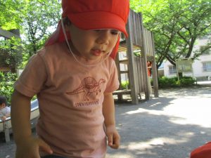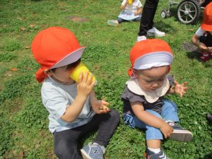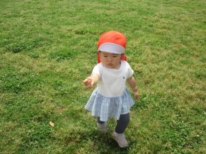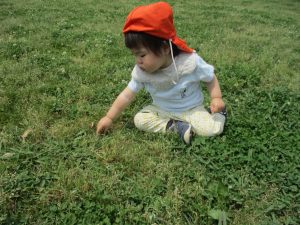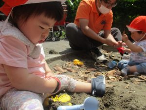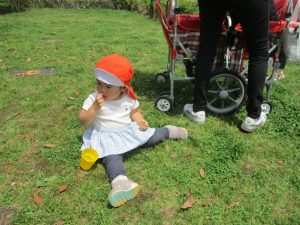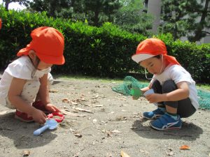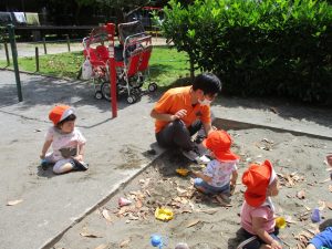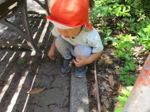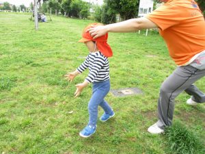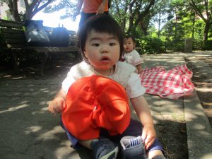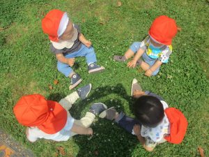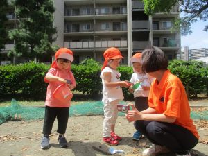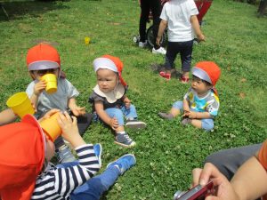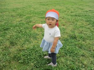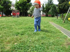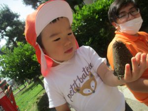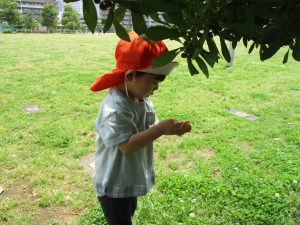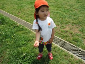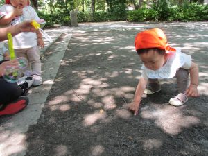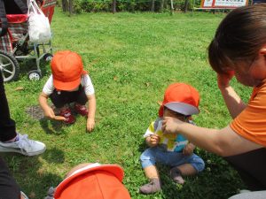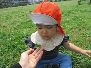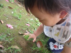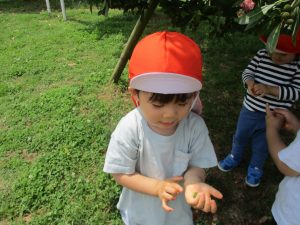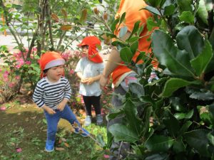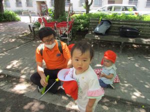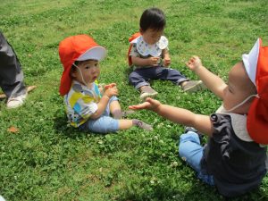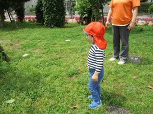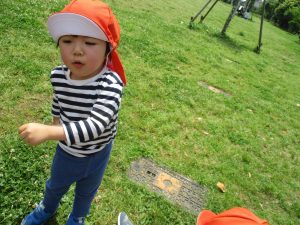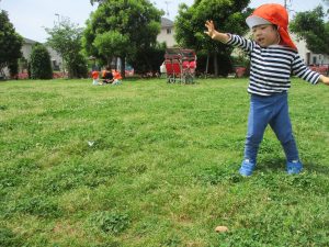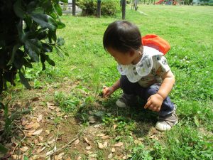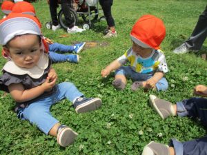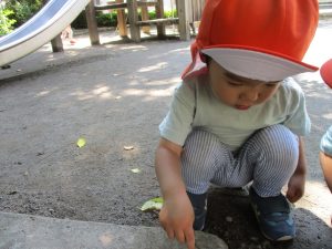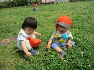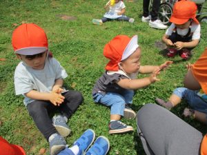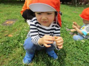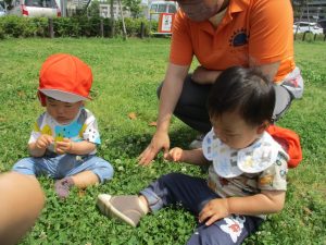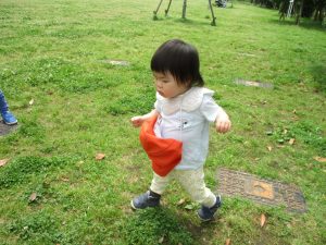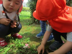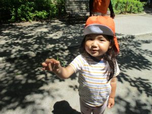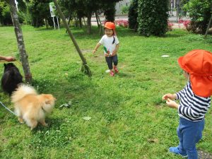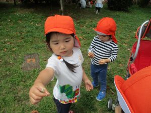 散歩中の犬に出会って遊んだり、たくさんのちょうちょうを見つけて追いかけたり、緑色の木の実を見つけて拾ったりして、存分に戸外活動を楽しむことができました。