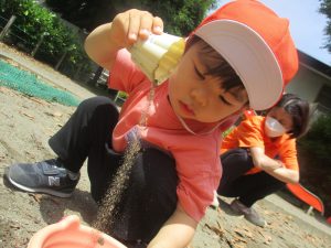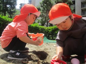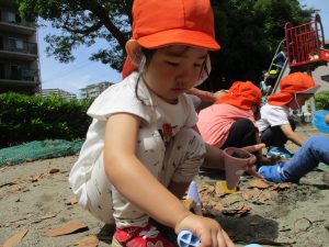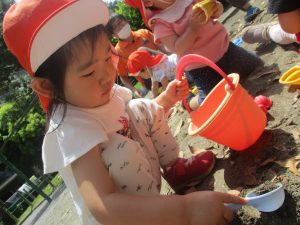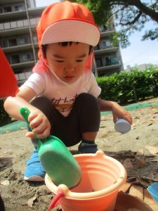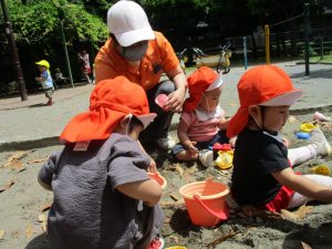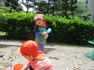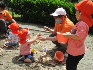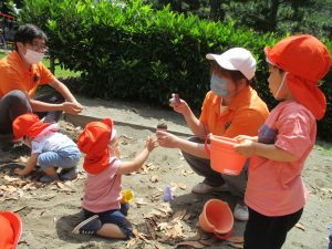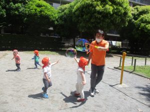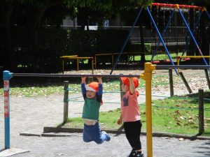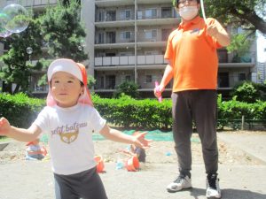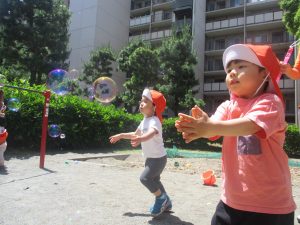砂場でのままごと遊びを楽しんだり、シャボン玉を追いかけたり固定遊具を使う等思い切り体を動かして過ごしました。