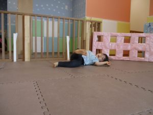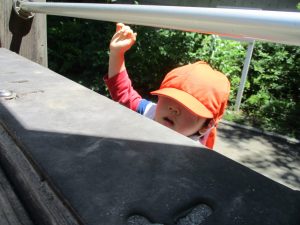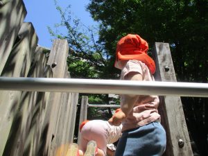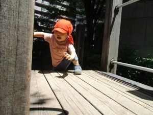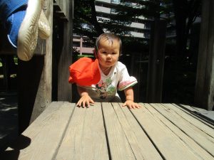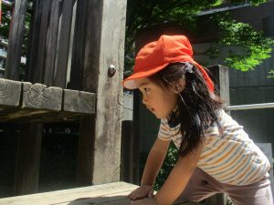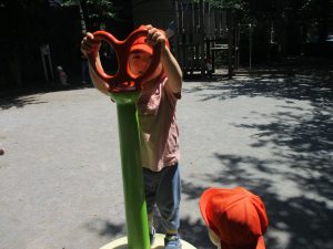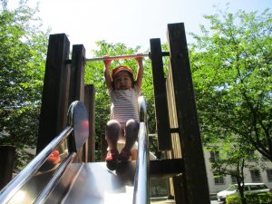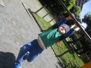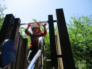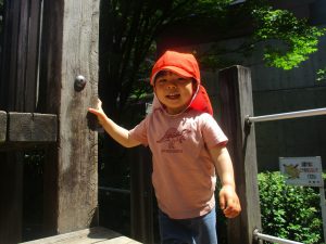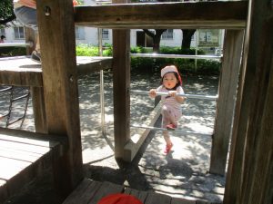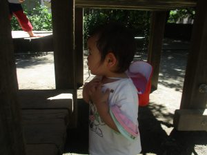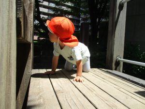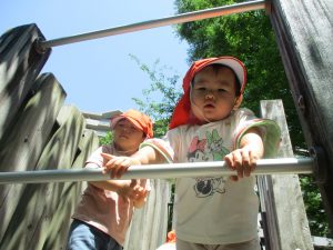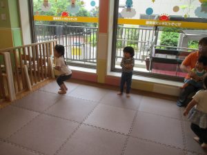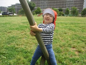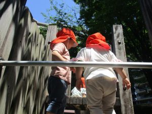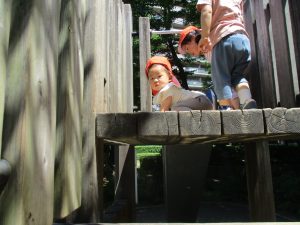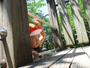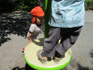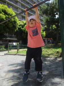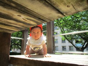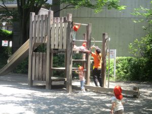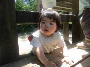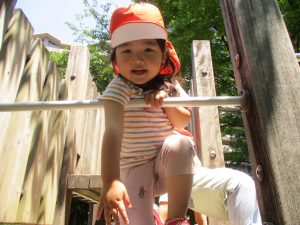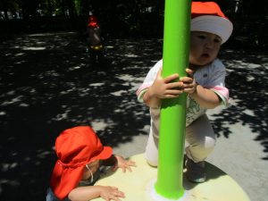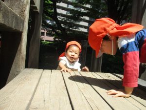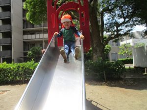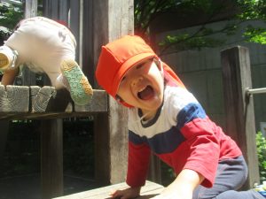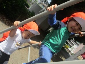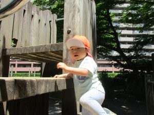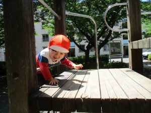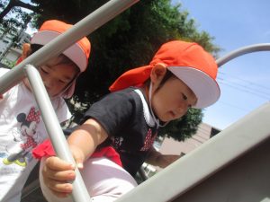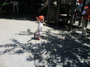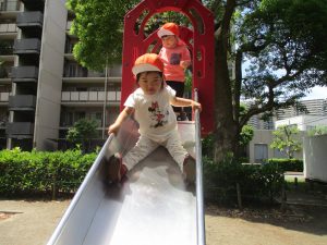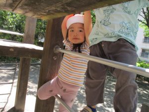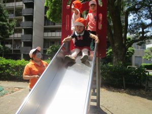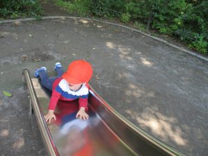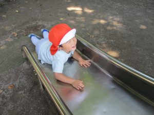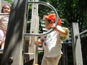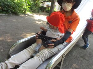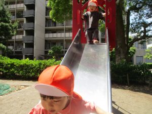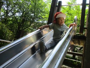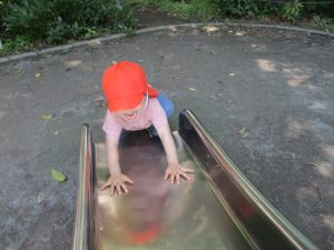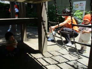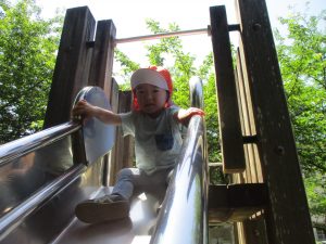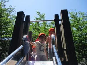 2歳児クラスのお友達は、階段からだけではなく横のチェーンやパイプを使って滑り台に黙々と登る姿もみられ、年齢ごとの遊びの違いも感じることができました。