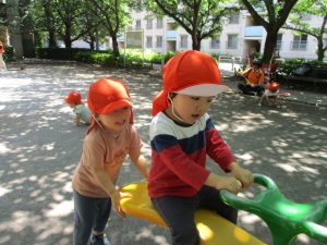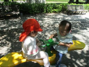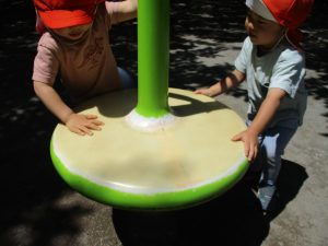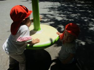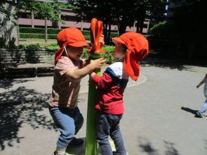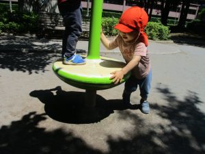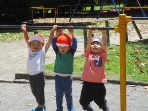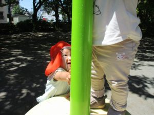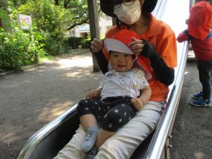 久しぶりのさくら公園の遊具に「まてまて―♡」と大いに盛り上がる2歳児クラスのお友達の姿が見られました。