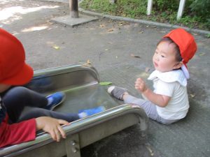 そんな元気いっぱいの2歳児さんの様子をみて「わぁ♡」と1歳児クラスのお友達もつられて滑り台やシーソーなど遊具にチャレンジ!