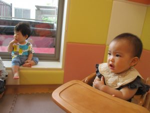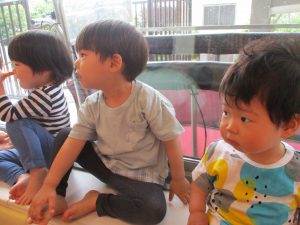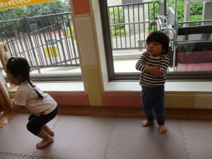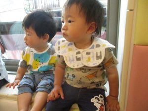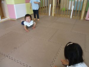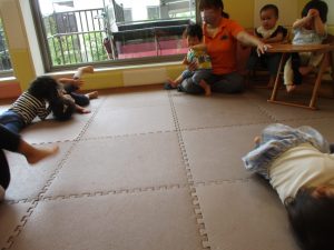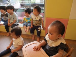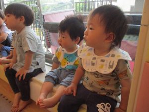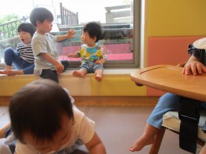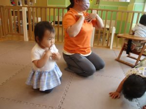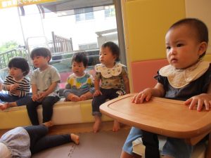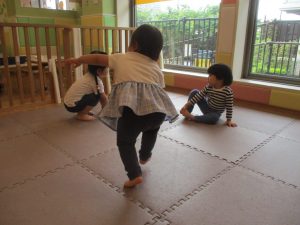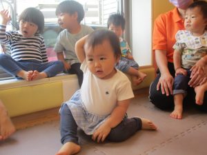 1歳児クラスのお友達が、自然とみんなで向かい合って遊んでいる様子もなんとも微笑ましい光景ですね♡