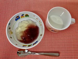 粥 野菜スープ(たまねぎ) 鶏と野菜の煮物 ほうれん草のつぶし煮 バナナ