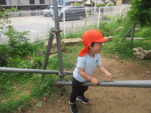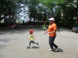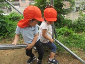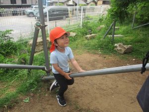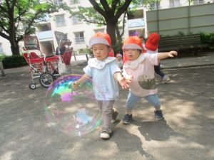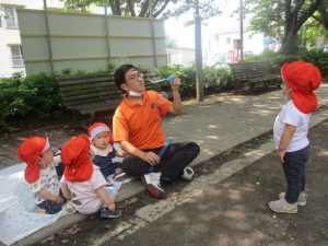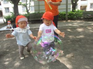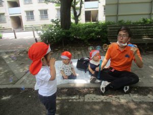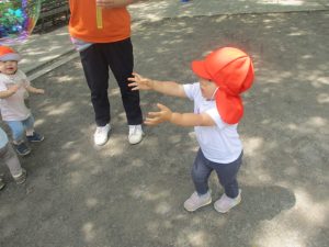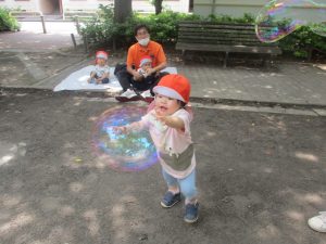 公園内ではシャボン玉を追いかけたり、固定遊具を使用して楽しそうに体を動かしておりました。