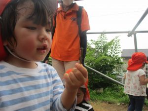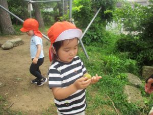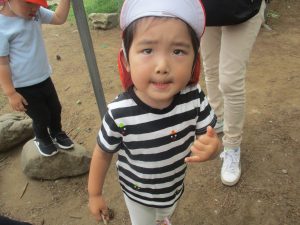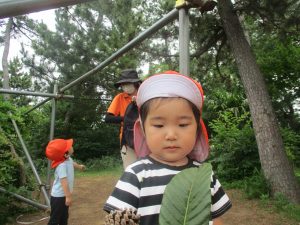 木の実や葉っぱ等、たくさんの自然物を大事そうに握りしめ林内の大冒険を皆で楽しみました。