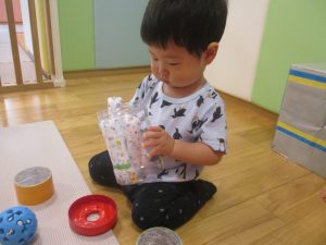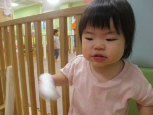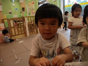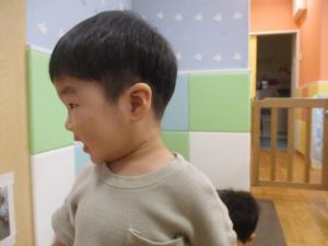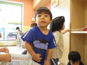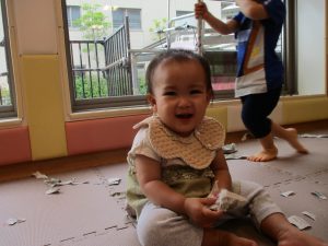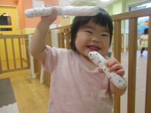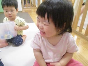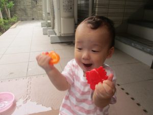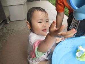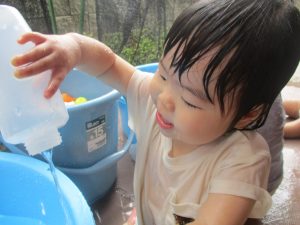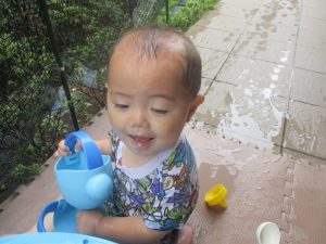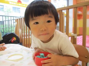 美味しそうに食べてくれ、初日から完食でございます。入園より2週間が経ち日に日に笑顔の時間も増え、水遊びも豪快に遊べております。