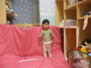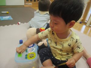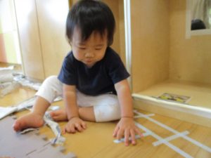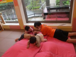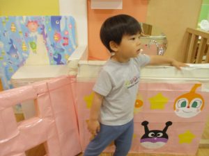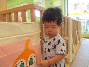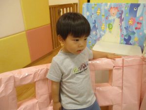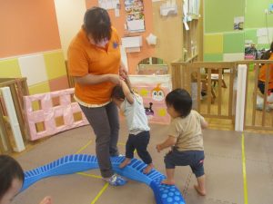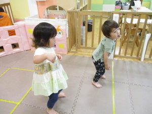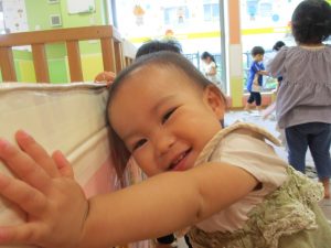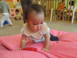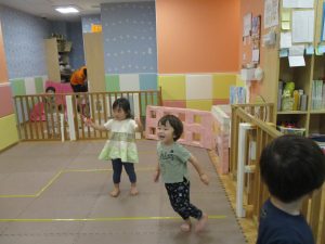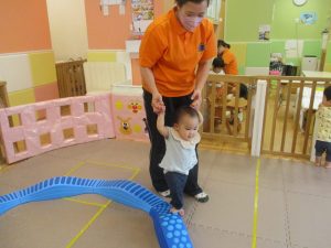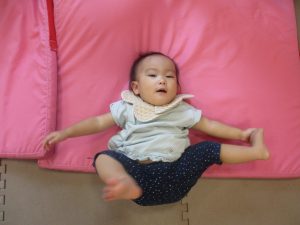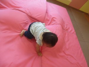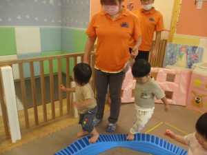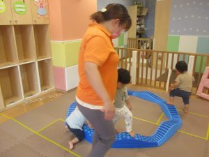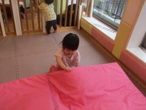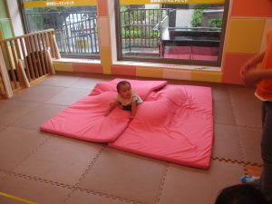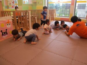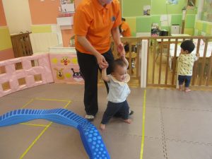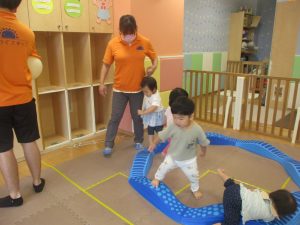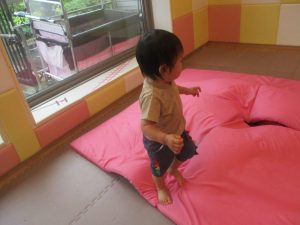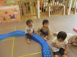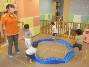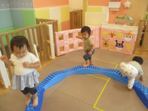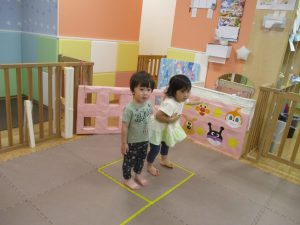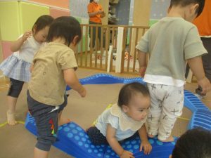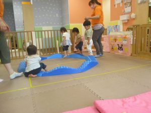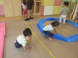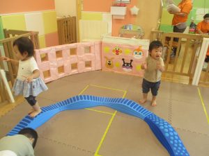 1歳児クラスのお友達は、体操の後はお部屋に大きなサーキットコーナーを設置して、のびのびと身体を動かして遊んでおりました。