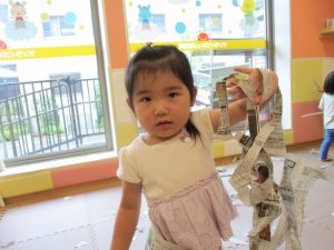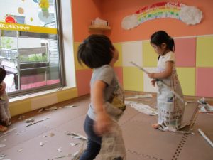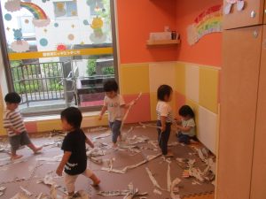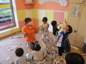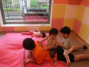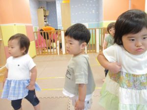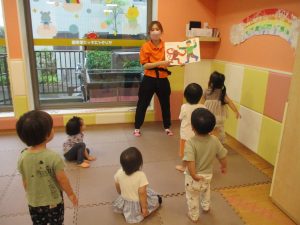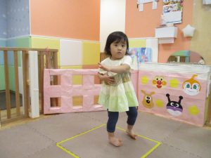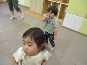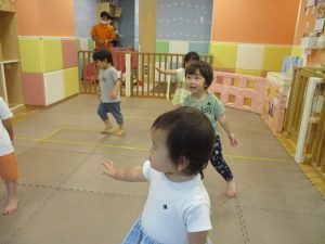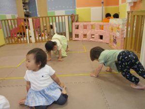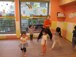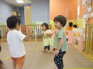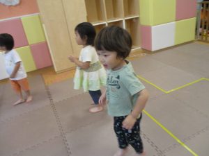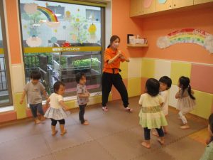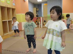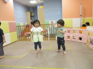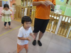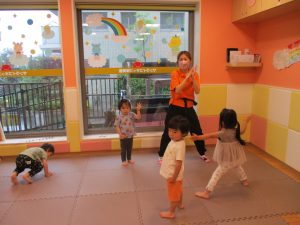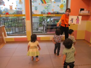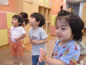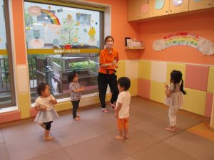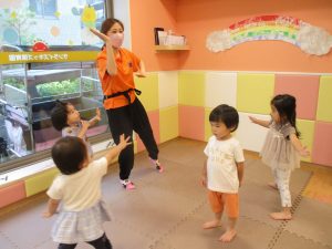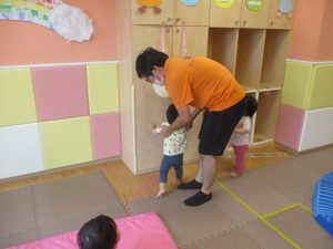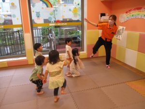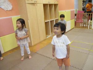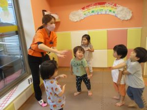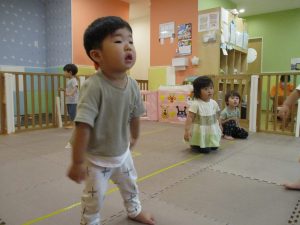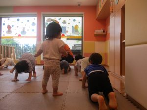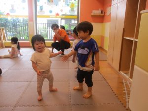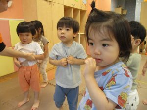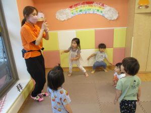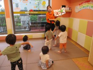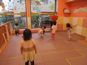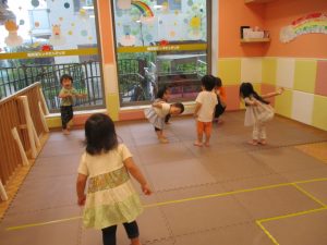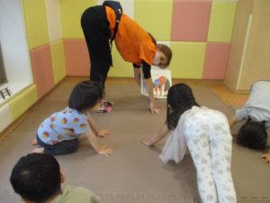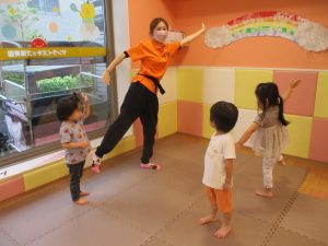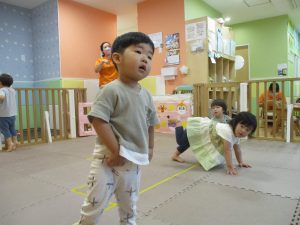 「からだ☆ダンダン」「できるかな?」「頭からつま先までの動物体操」「しゅりけん忍者」など馴染みのものから新しい体操まで元気いっぱいに体を動かして遊びました。