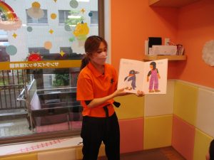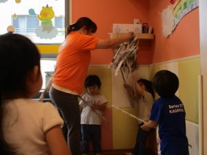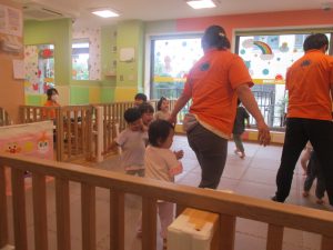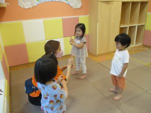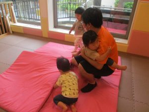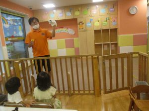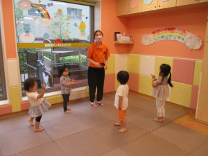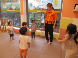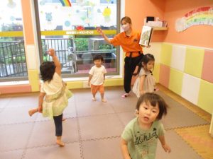大粒の雨にも負けずお子様たちの元気はいっぱい!と言うことで、本日はお子様達のリクエストにお応えしながらたくさんの踊りや体操で体を動かして遊びました。