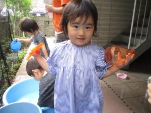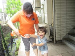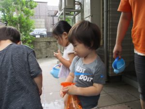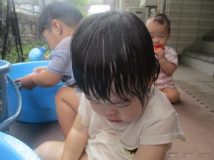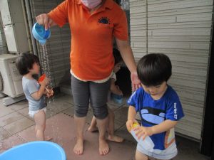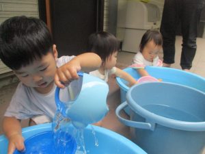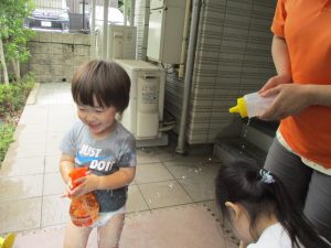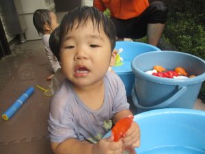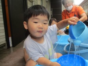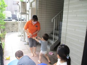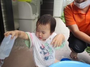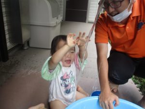 日中は年齢別に分かれて水遊びを行いました。