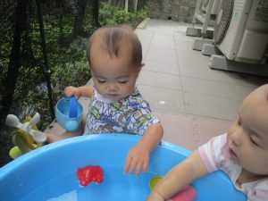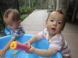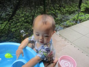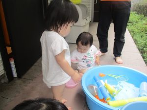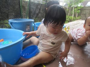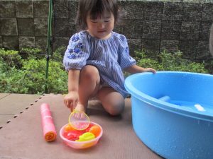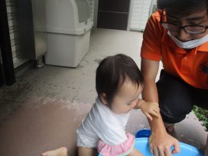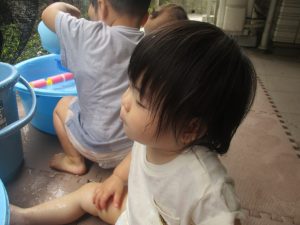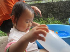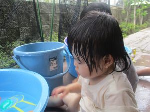 水遊びそのものにお子様達が慣れてきてくれたようで、それぞれが好きな玩具を見つけては水の感触を味わったり、時には空を見上げて夏の解放感を存分に味わっております。