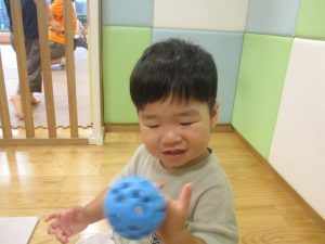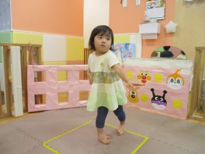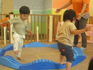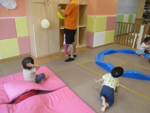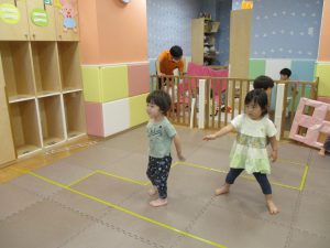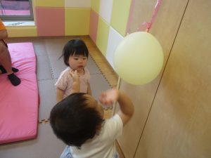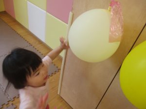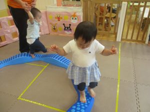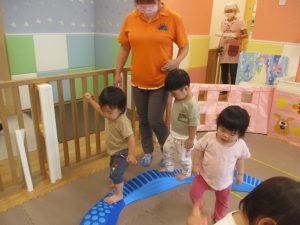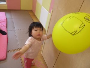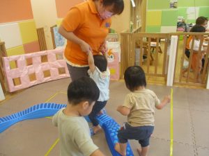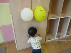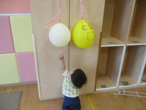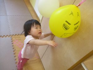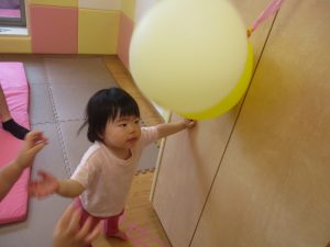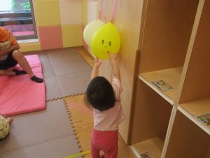 先生やお友達と一緒にバランスストーン歩きに挑戦したり、大きな風船を見つけて手を伸ばしたりして思い思いに過ごしておりました♪