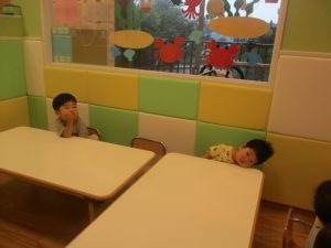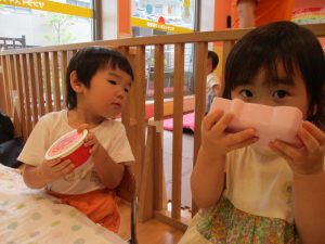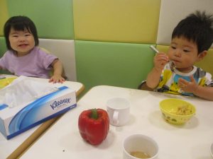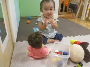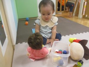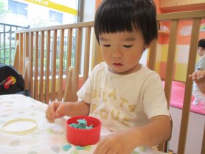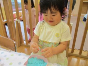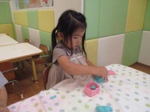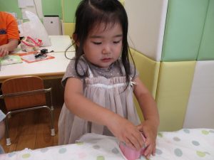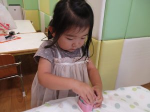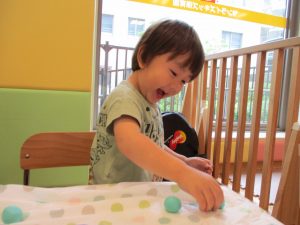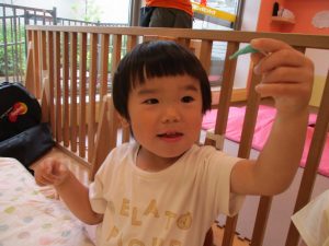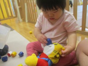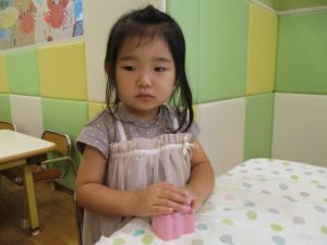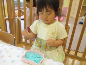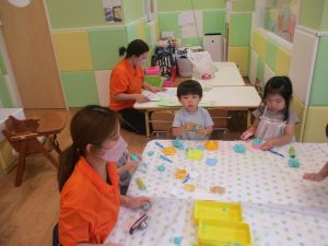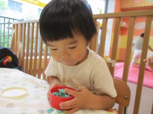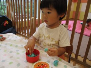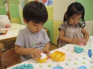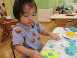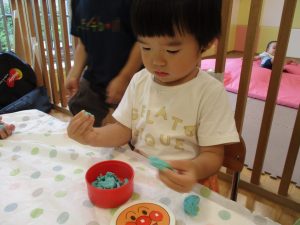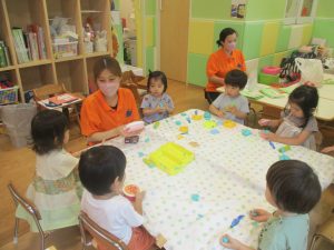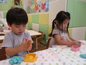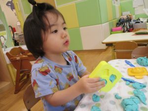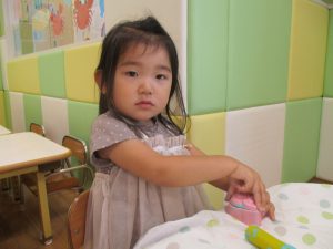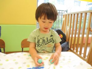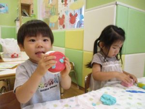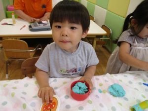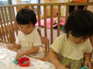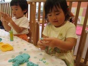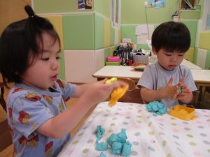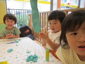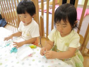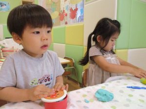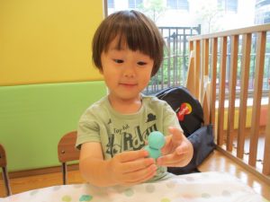 2歳児クラスのお友達は、体操の後は先生やお友達と「お弁当、いただきまーす♪」や「消防車!走りまーす!」と粘土でいろいろな物を作りながらやりとりを楽しんでおりました♪