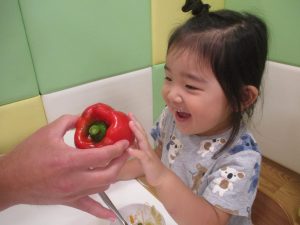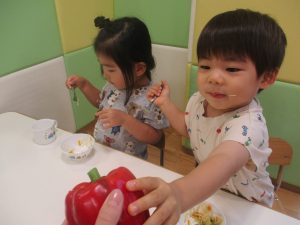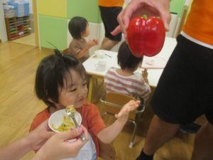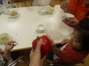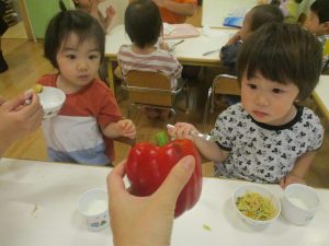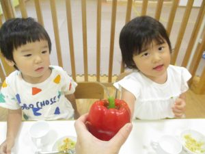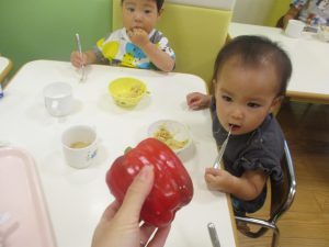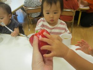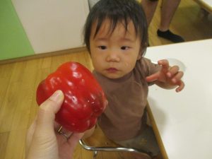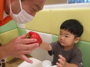 お子さまたちの手よりも大きなパプリカに「わぁ!おおきい~!」と歓声と共に、あの有名な「パプリカ」の歌まで歌いだすお子様たちでした♪