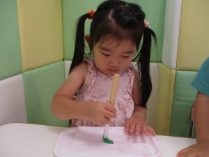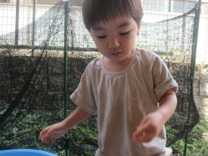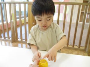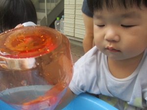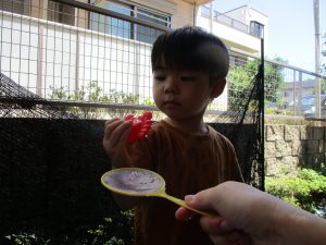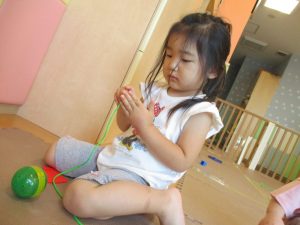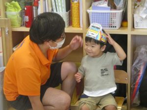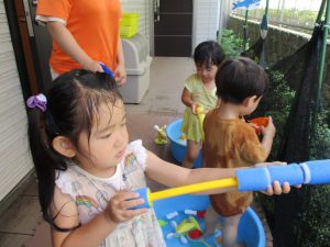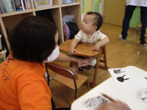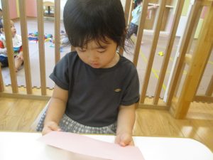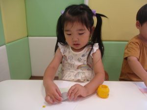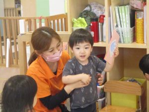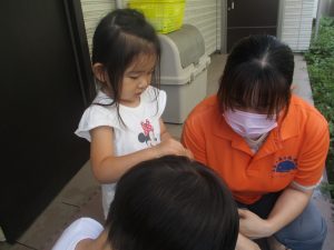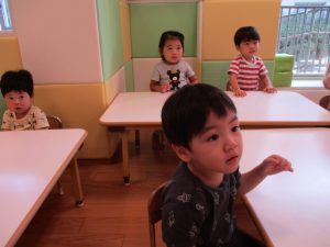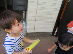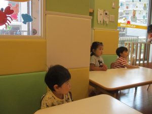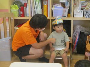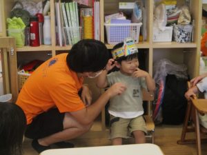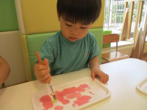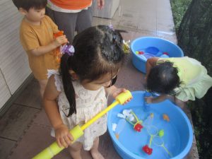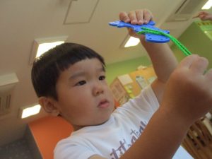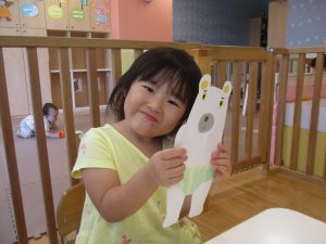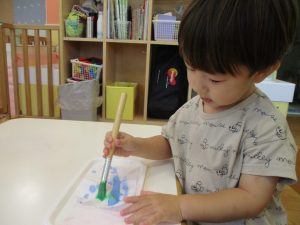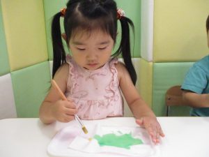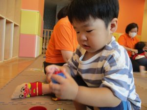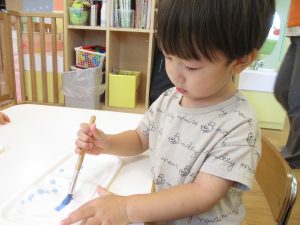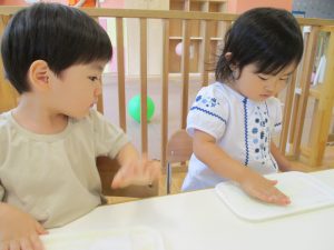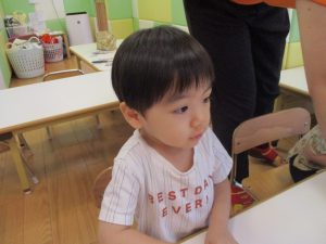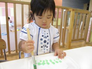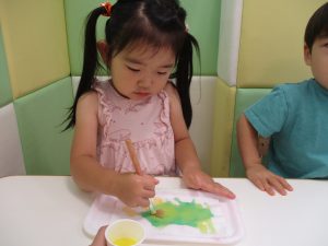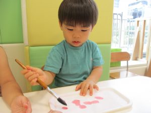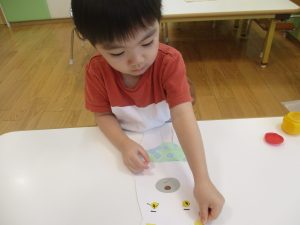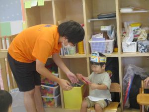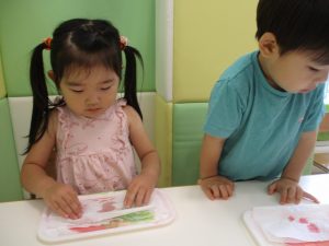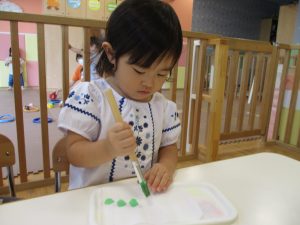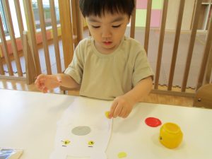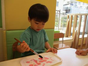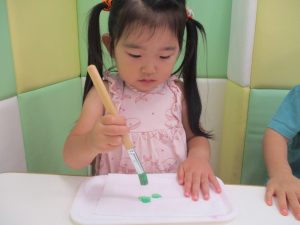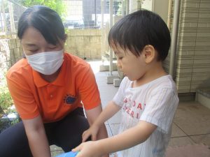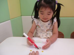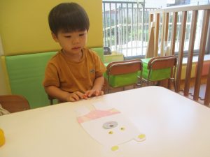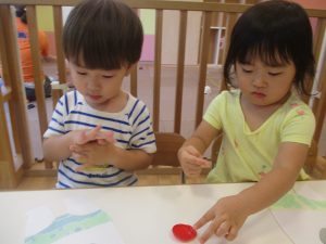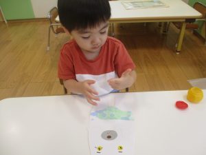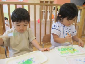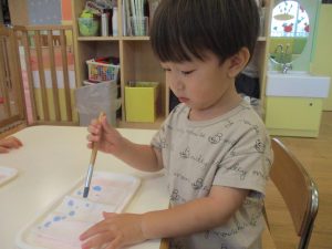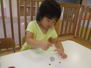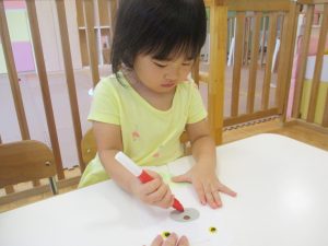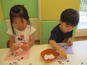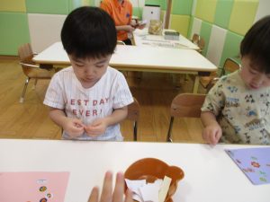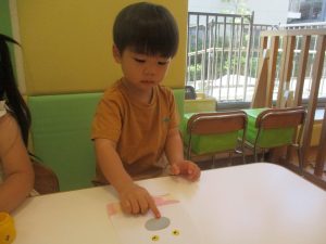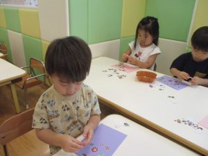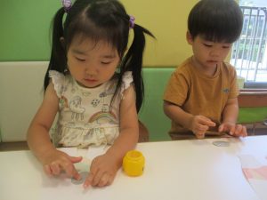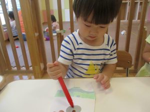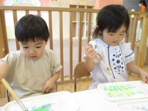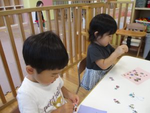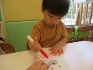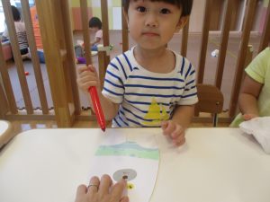 水遊びの待ち時間、2歳児クラスのお友達は前日の製作の続きを行いました♪