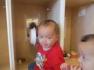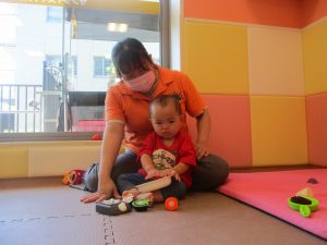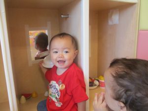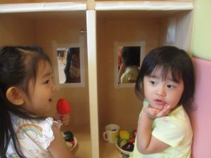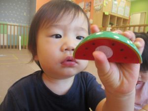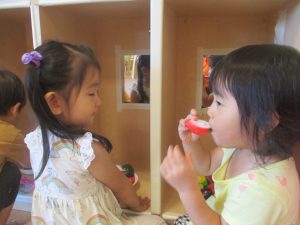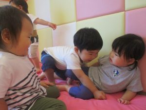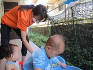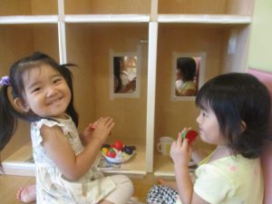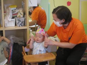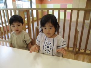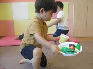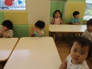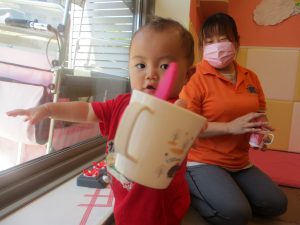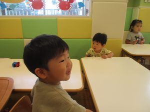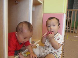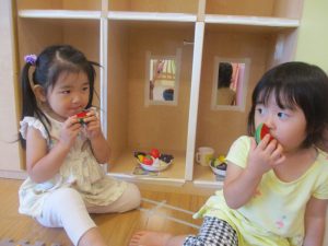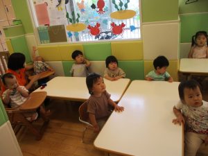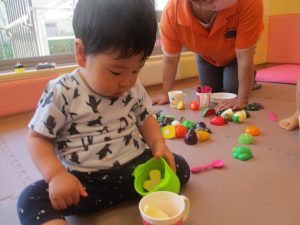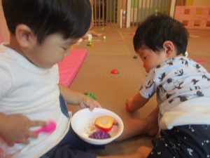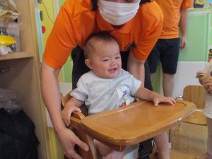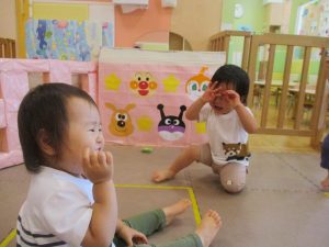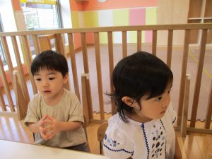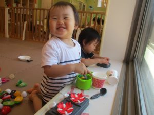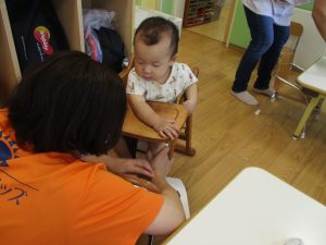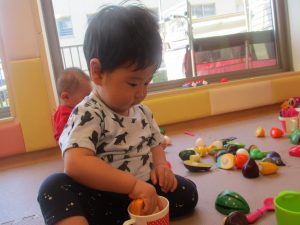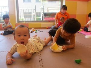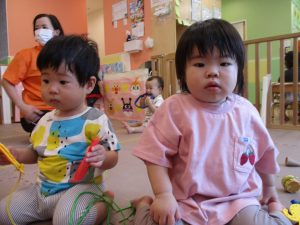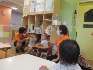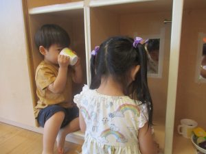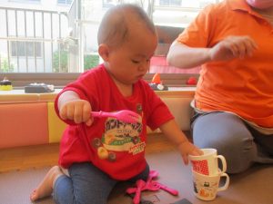 0、1歳児クラスのお友達は先生と一緒に「いただきまーす♡」や「かんぱい♡」とおままごとセットでパーティーをしたり、お友達とお顔を合わせてお話をしたりしてとても可愛らしい姿が見られておりました♡