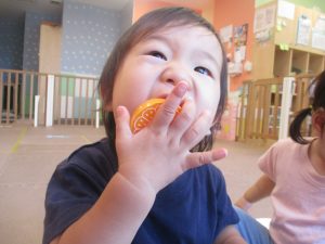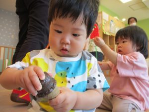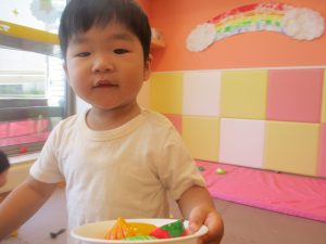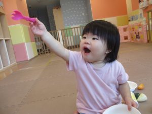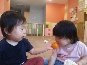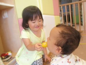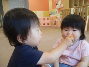 2歳児クラスんのお兄さんお姉さんから「はいどーぞ♡」とご馳走をもらって、微笑む姿にも先生たちはうっとりとしておりました♡