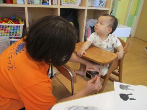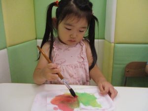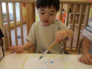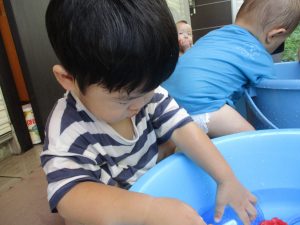 布の感触を手で確かめながら、水で薄めた絵の具を乗せ、「うああ!」と布に滲んでいく絵の具の様子や色が混ざっていく様子を楽しんでおりました♪