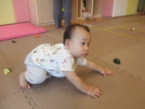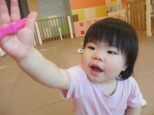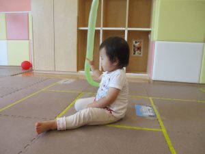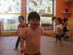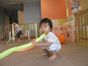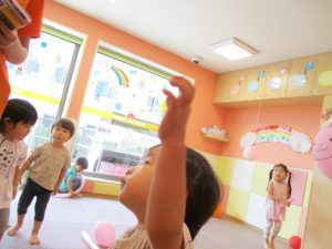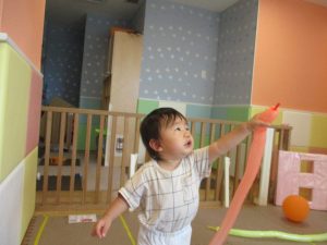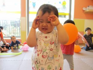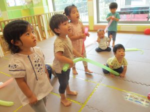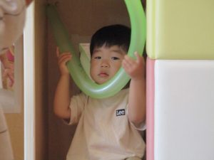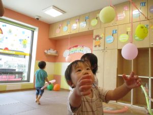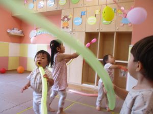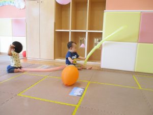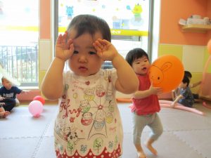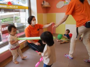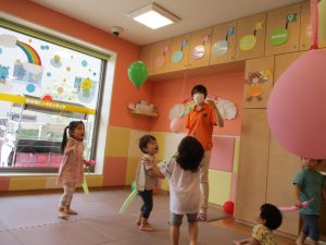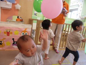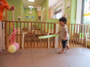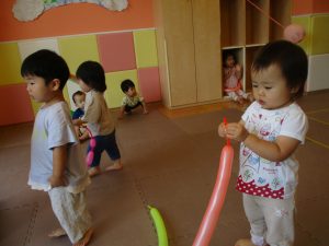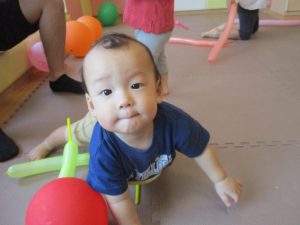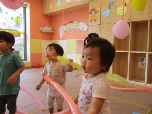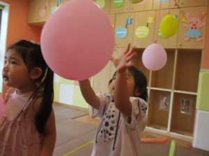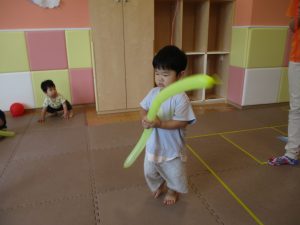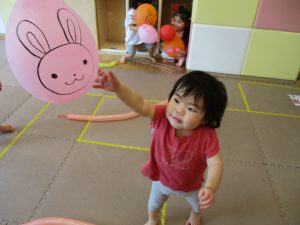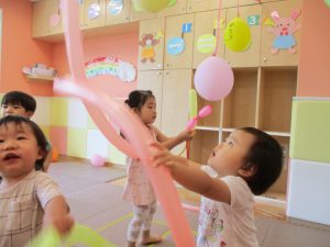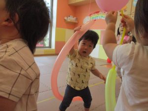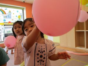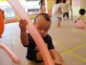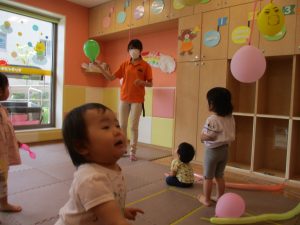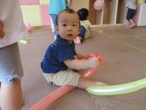 0、1歳児クラスのお友達は丸い大きな風船やバルーンアート用の長い風船を使って、先生やお友達と一緒に体を動かして楽しんでおりました。