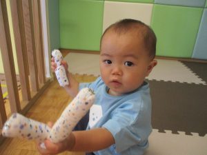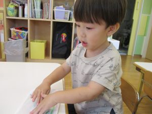 絵の具遊びは何度も楽しんでおりますが、布を使った製作は初めて行いました。