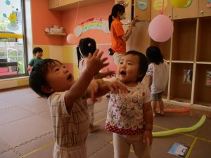 途中2歳児クラスのお友達が加わると、更に盛り上がって風船を飛ばしたり、キャッチしたりして遊んでおりました♡