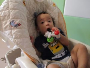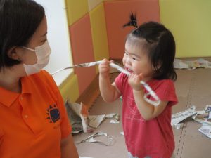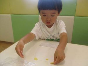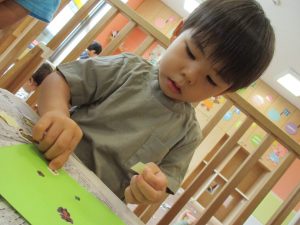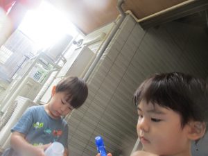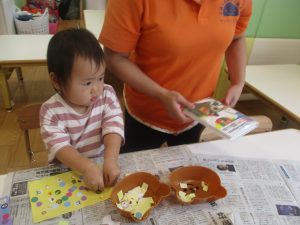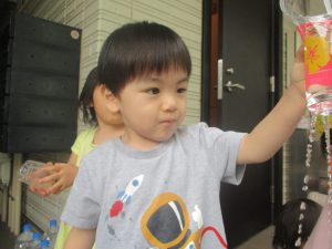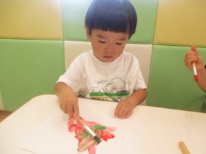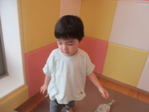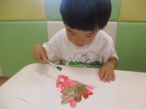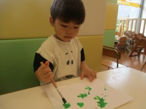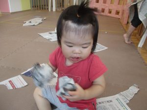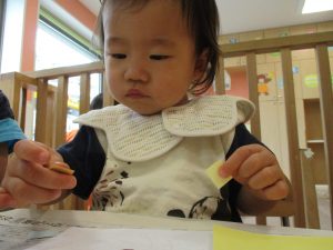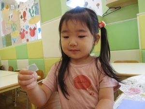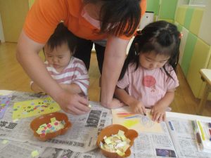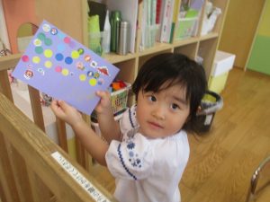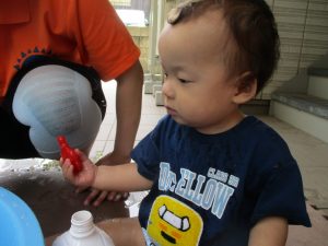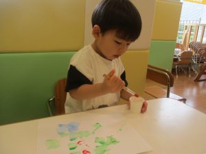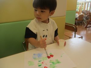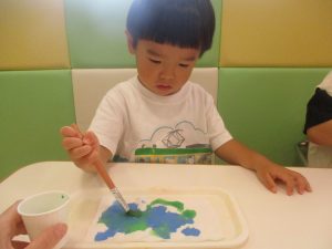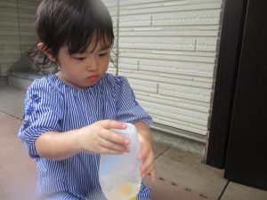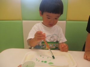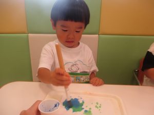 先生と一緒に「青色がいいな!」と好きな色を選んだり「こんないろになったよ!」と色が混ざって変わっていく様子を不思議そうに見つめたりして過ごしておりました。