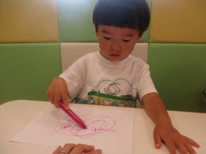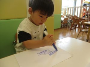 2歳児クラスのお友達は、絵の具やペンを使ったお絵描きを行いました。