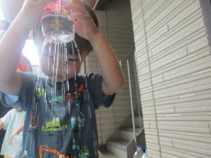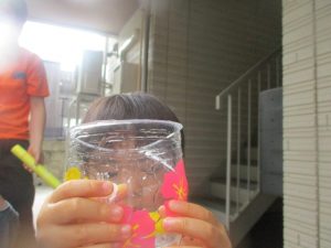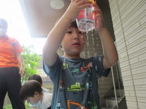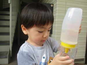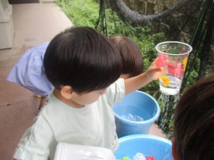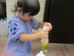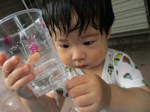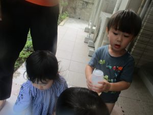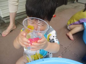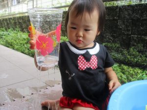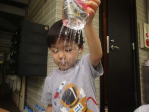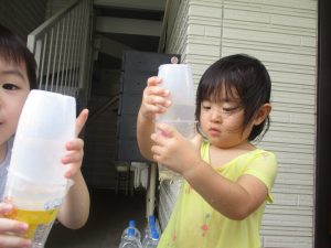 お水を入れるとシャワーのように流れ出ててくる、先生の手作りカップに大喜びのお子様たち♡