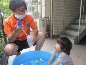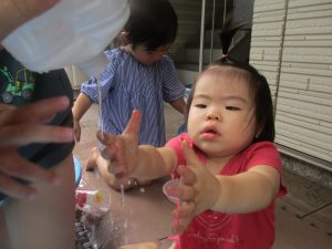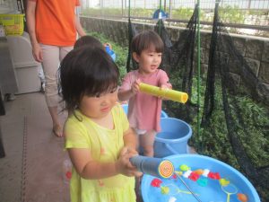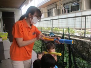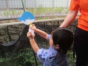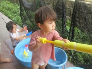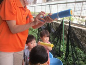 高い所から先生たちの流してくれる流水に触れたり、水鉄砲を使って「消火します!出動します!」と、消火遊びを楽しんだりするお子様たちの姿が見られました♪