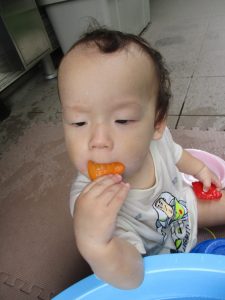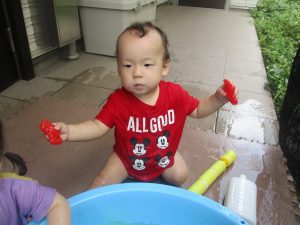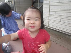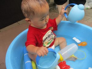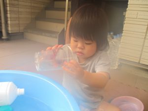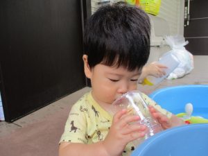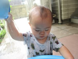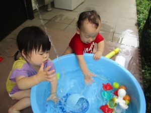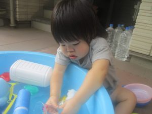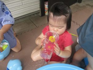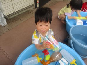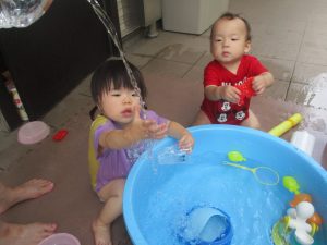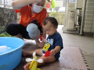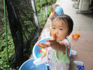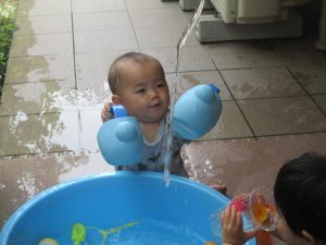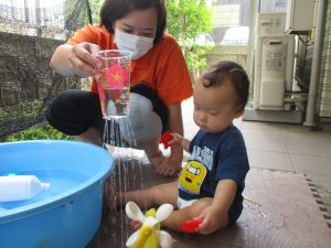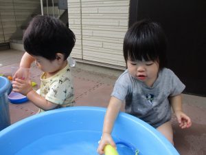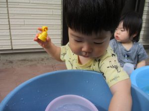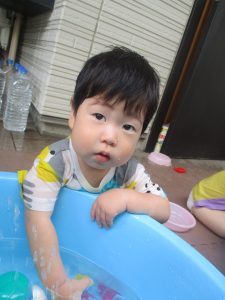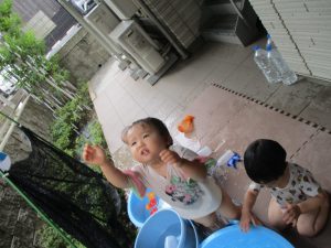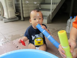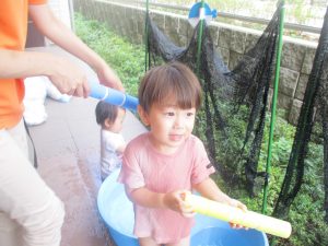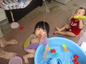 0、1歳児クラスのお友達は、本日も元気いっぱいに水遊びを行いました。