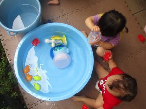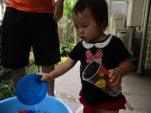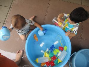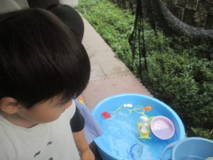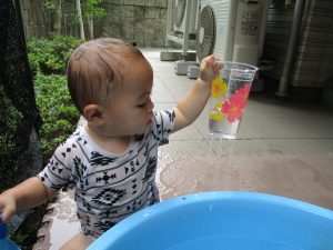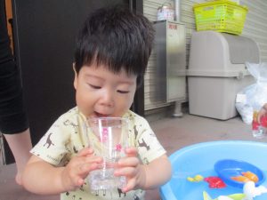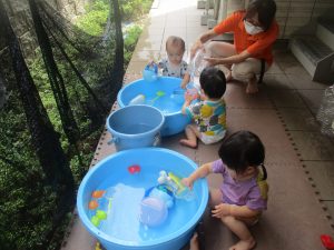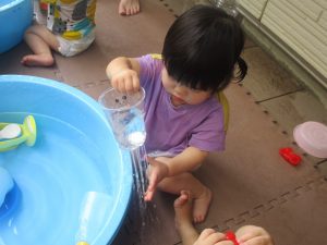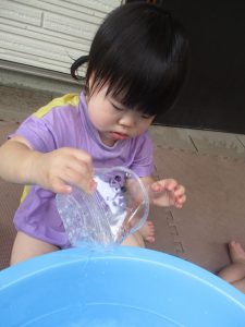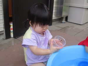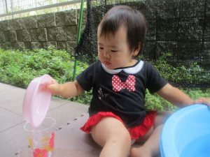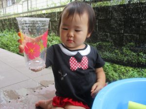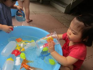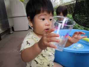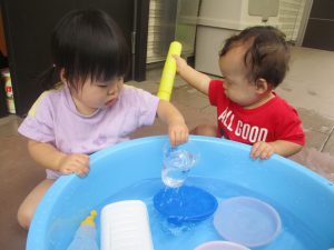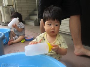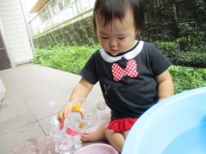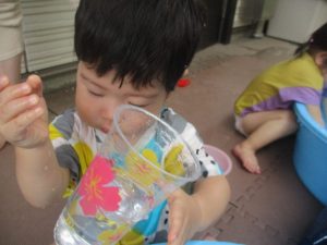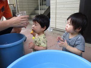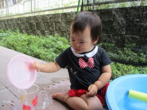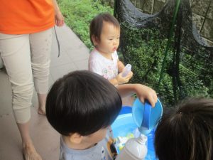 0、1歳児クラスのお友達も、先生やお友達の遊びを真似しながらキラキラと目を光らせて水遊びを行っておりました。