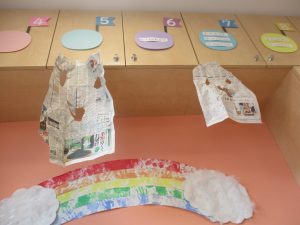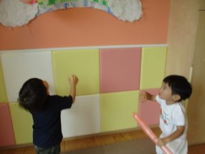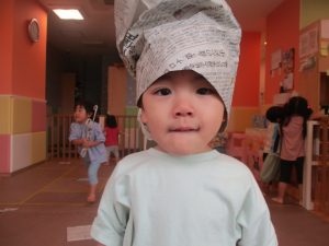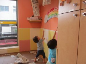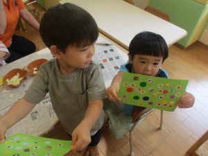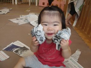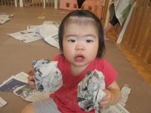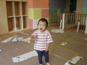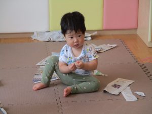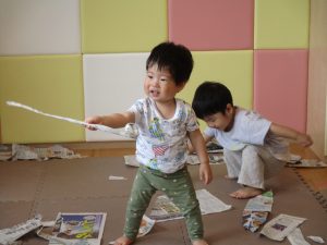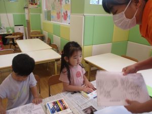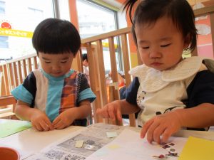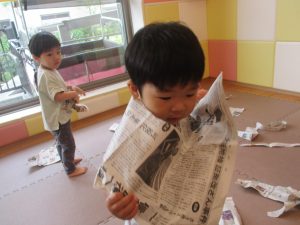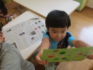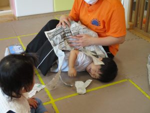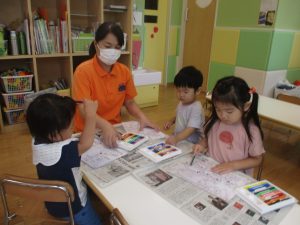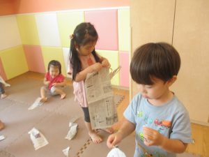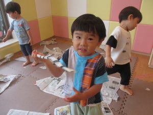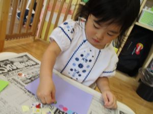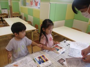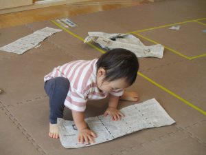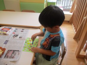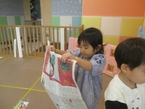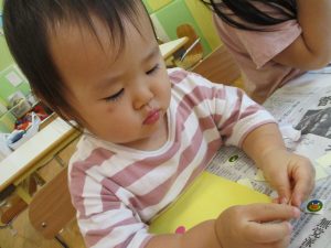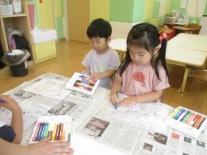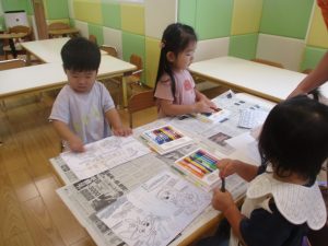 本日の水遊びの合間には、室内にて体操や新聞紙遊びで体を動かしたり、シール貼りやお絵描きなどでゆったりとした時間を過ごしたりしておりました。