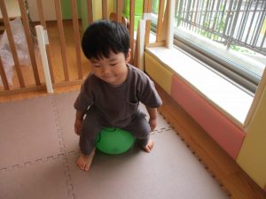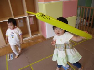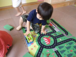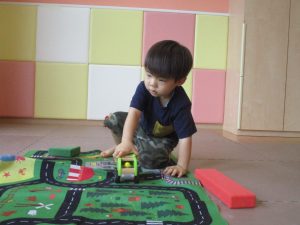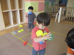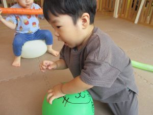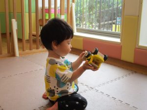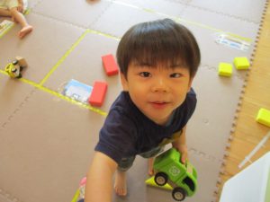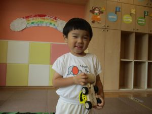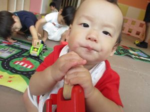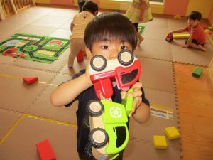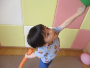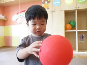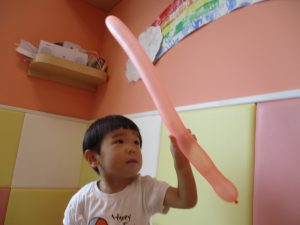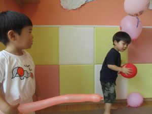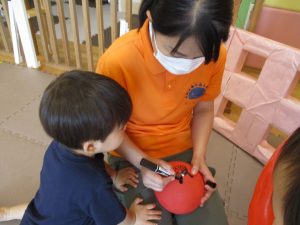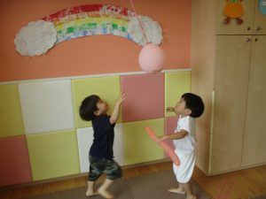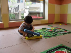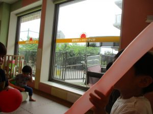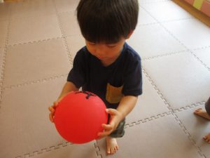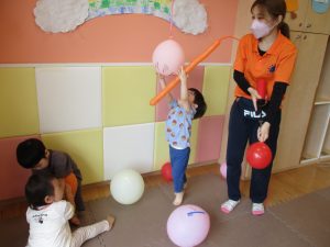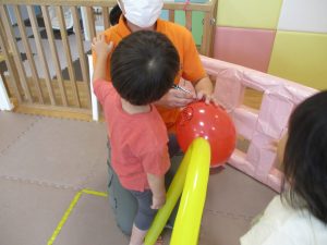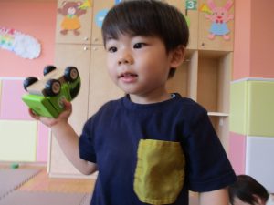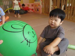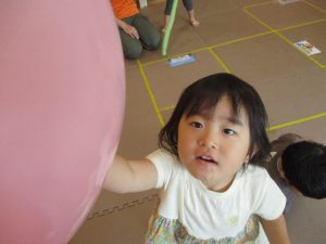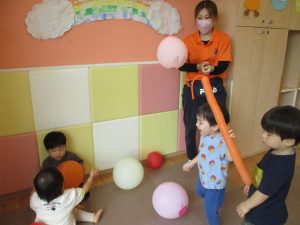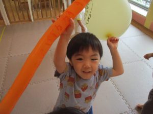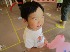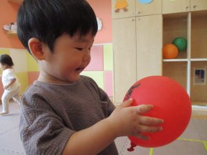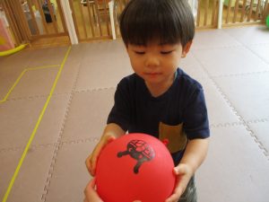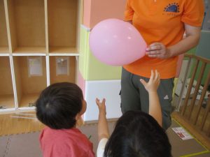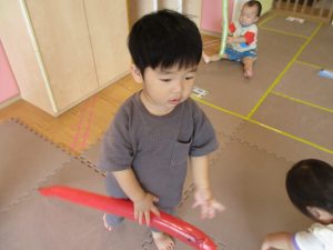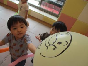 室内ではみんなで木製の車の玩具を使って遊んだり、風船を使って体を動かして遊んだりしておりました。