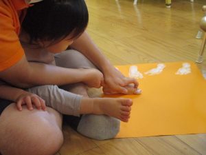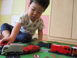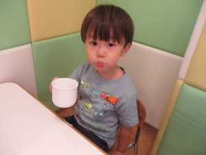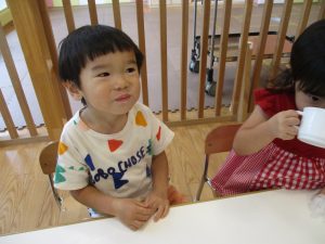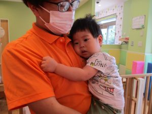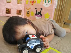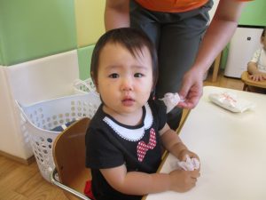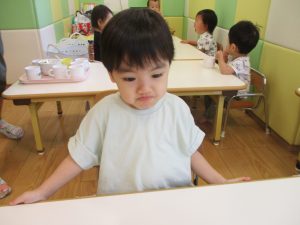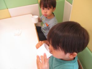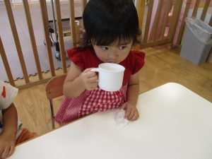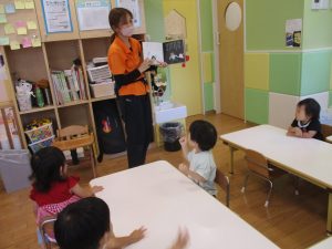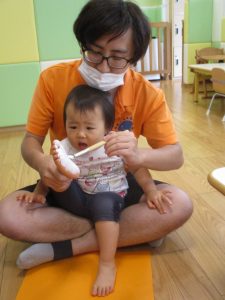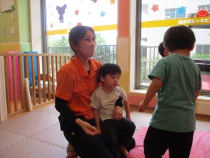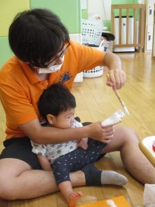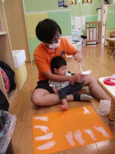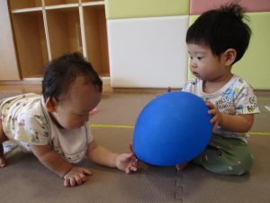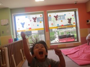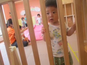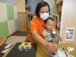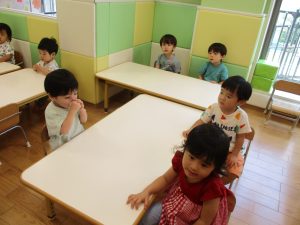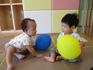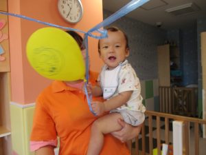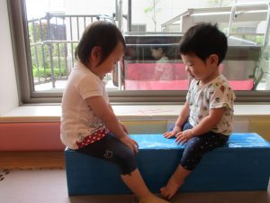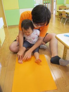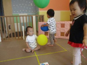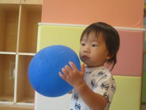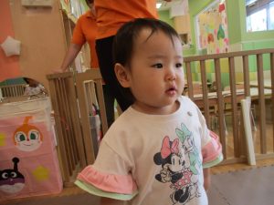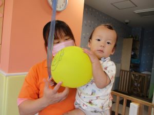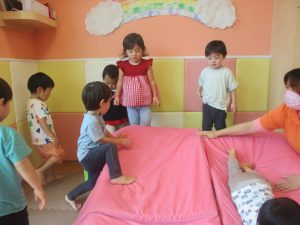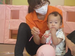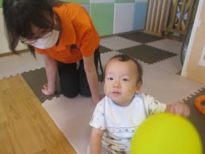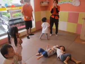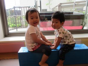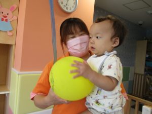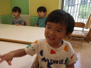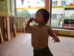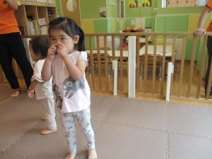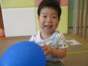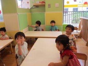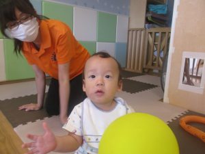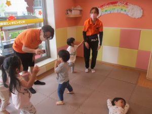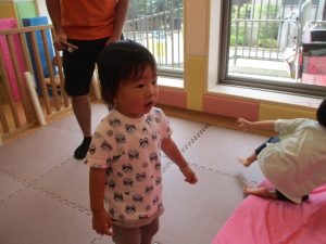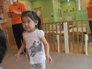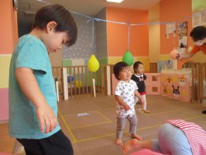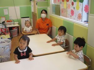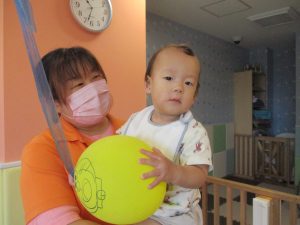 本日は、昨日の涼しさから再び夏の暑さへ。日中には気温が上がり「水遊びができるかな?」と言うところでしたが、病み上がりのお子様が多いことも考慮し、ゆったりと室内遊びを行うことにしました。