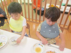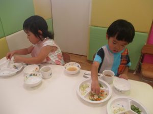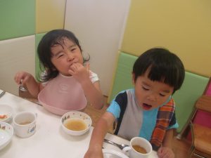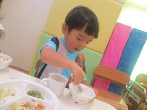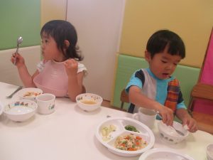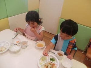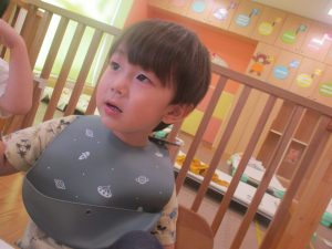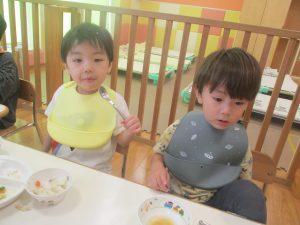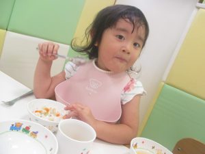 先週の寂しさとは打って変わって2歳児クラスにも活気が戻り始め、散歩後の谷津園給食もニコニコとモリモリで食べてくれました。